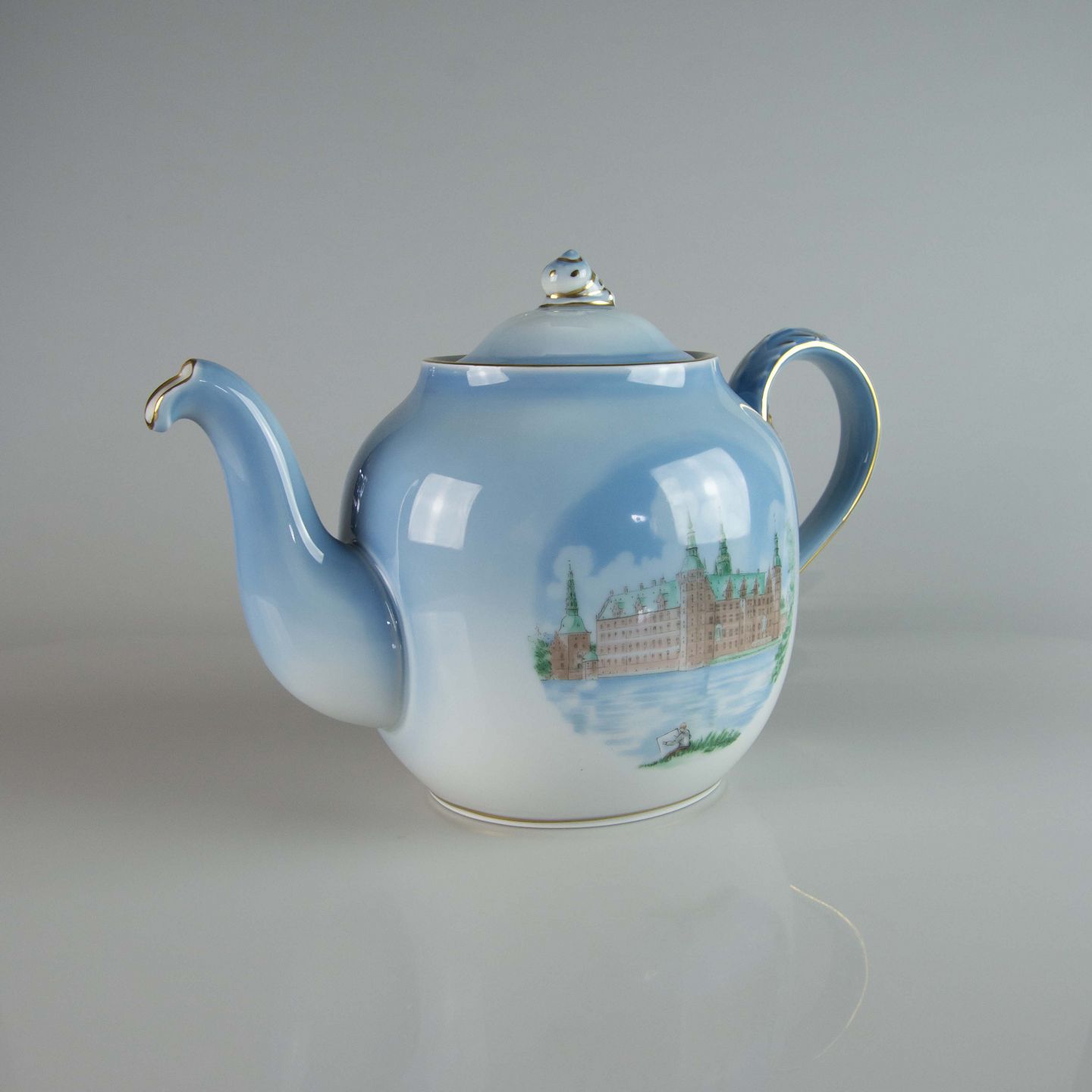 Tekande i porcelæn fra Danmarksstellet med guldkant og motiv af Kronborg. Nr. 656/3562
