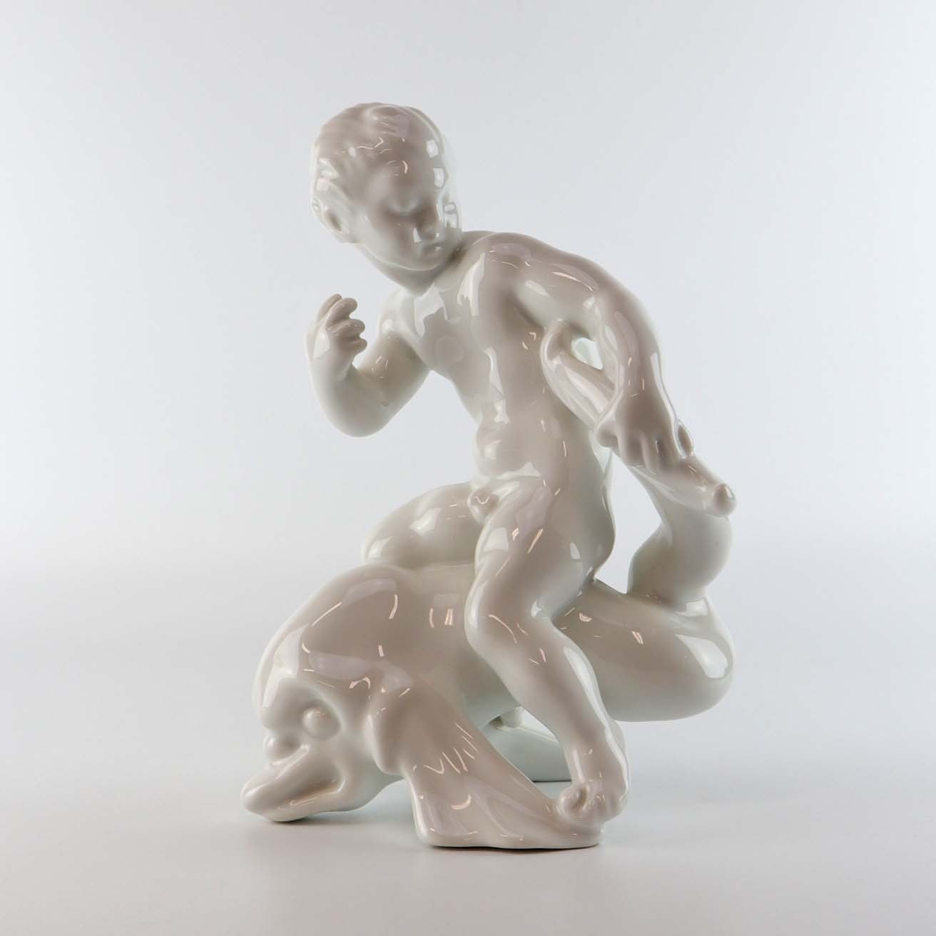 Blanc de chine figur i hvid porcelæn med motiv af dreng siddende på en delfin. Nr. 4060