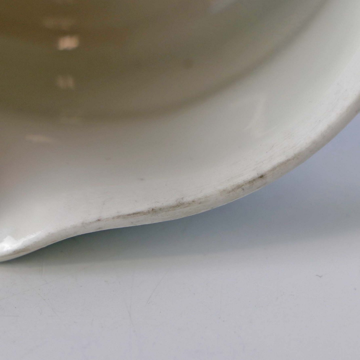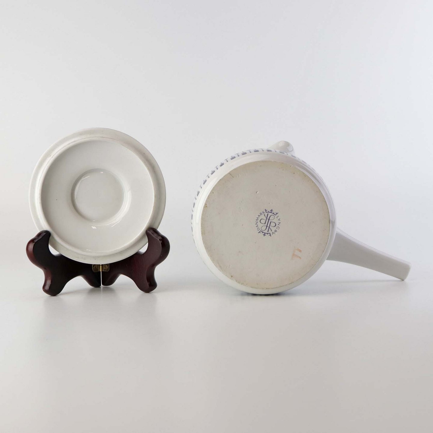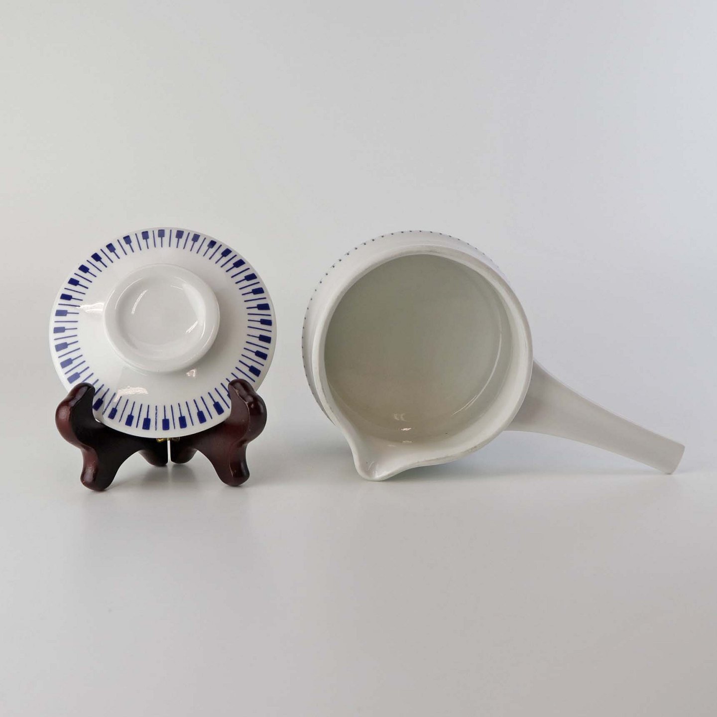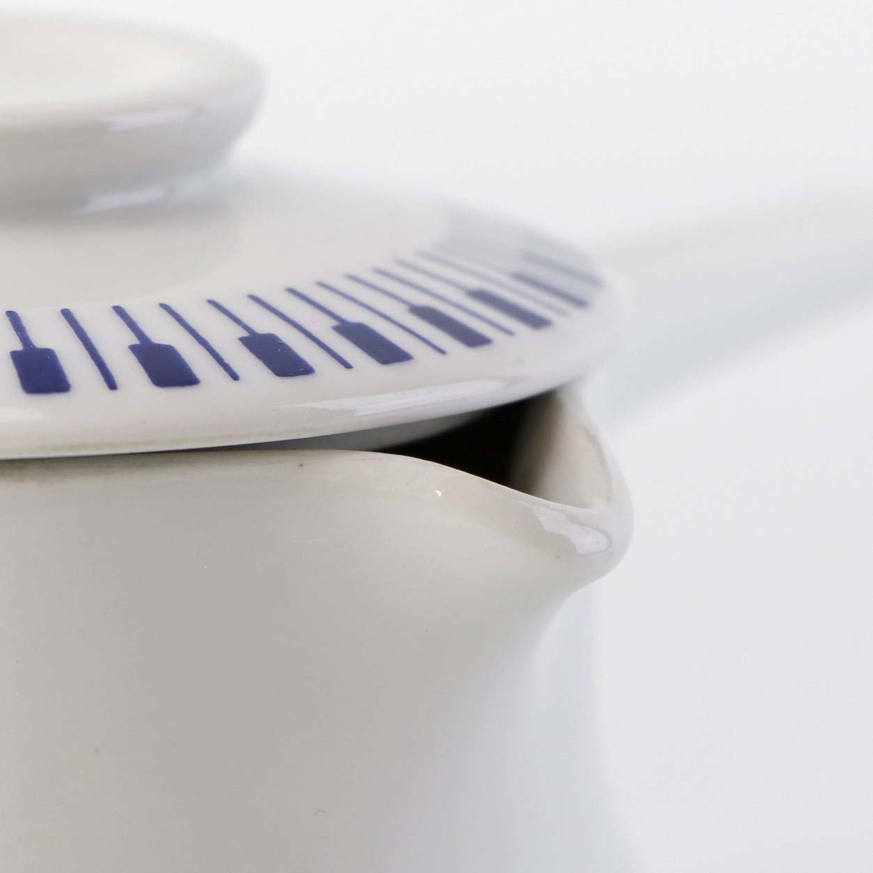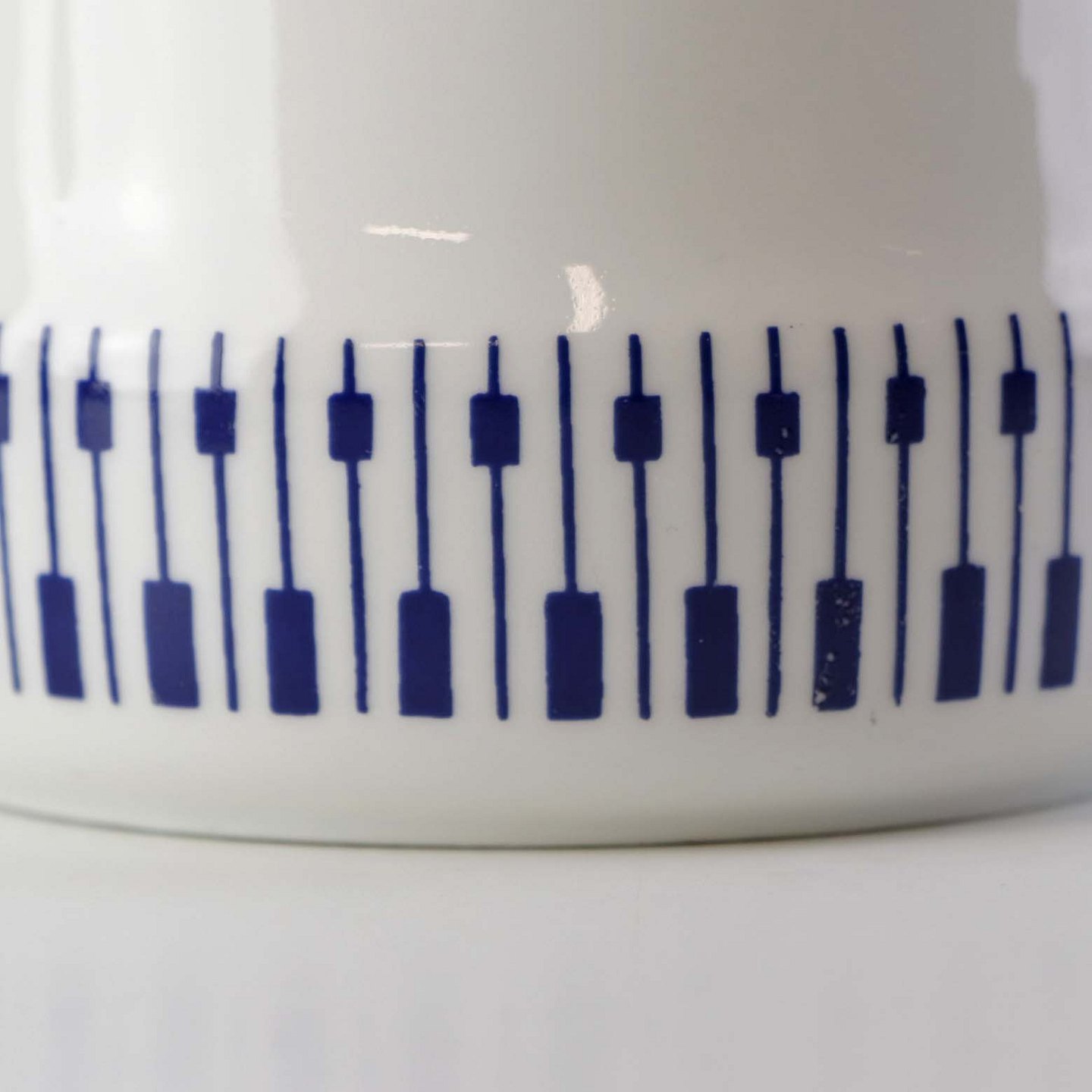Stellet er fremstillet i ildfast glat porcelæn dekoreret med mørkeblå tangenter på hvid baggrund.