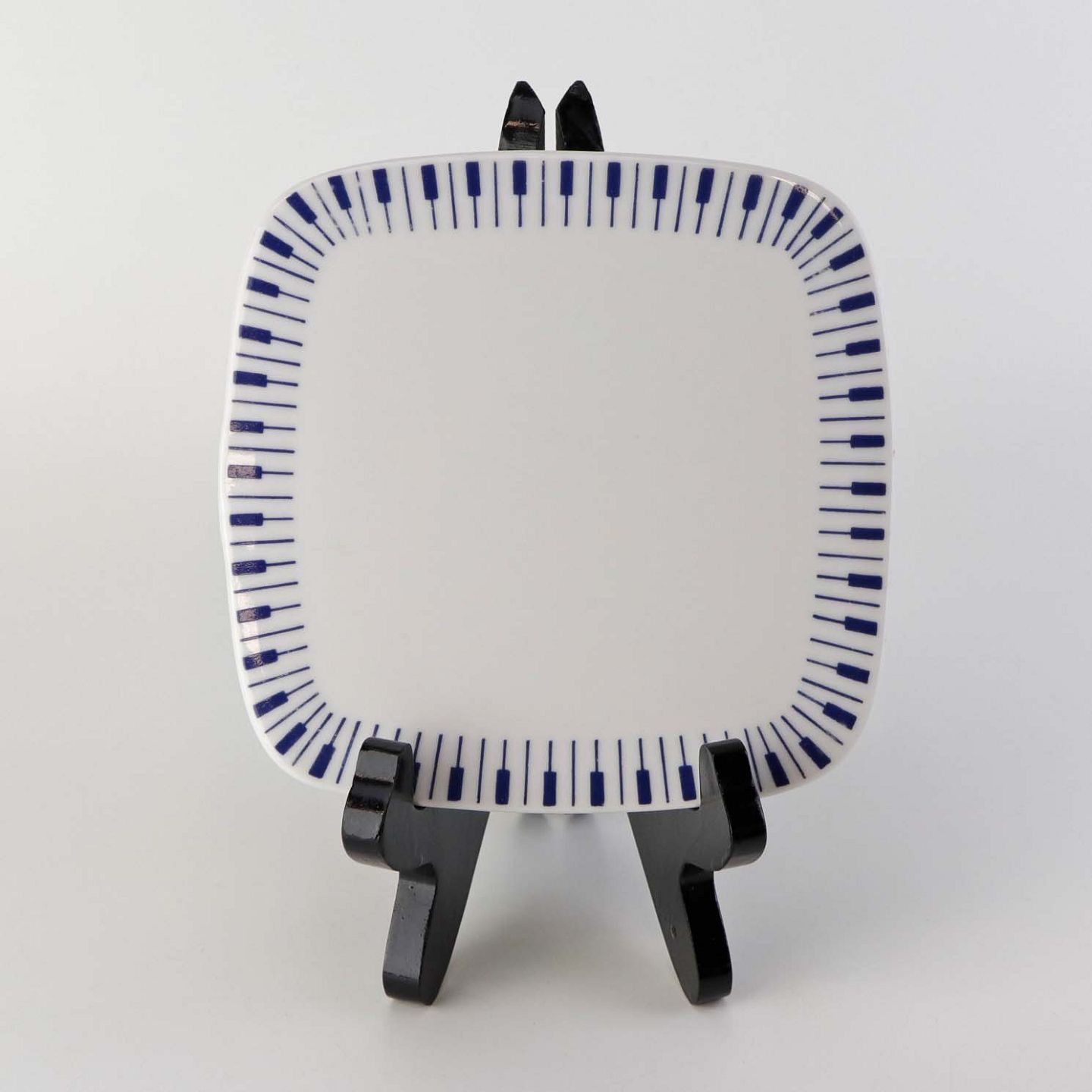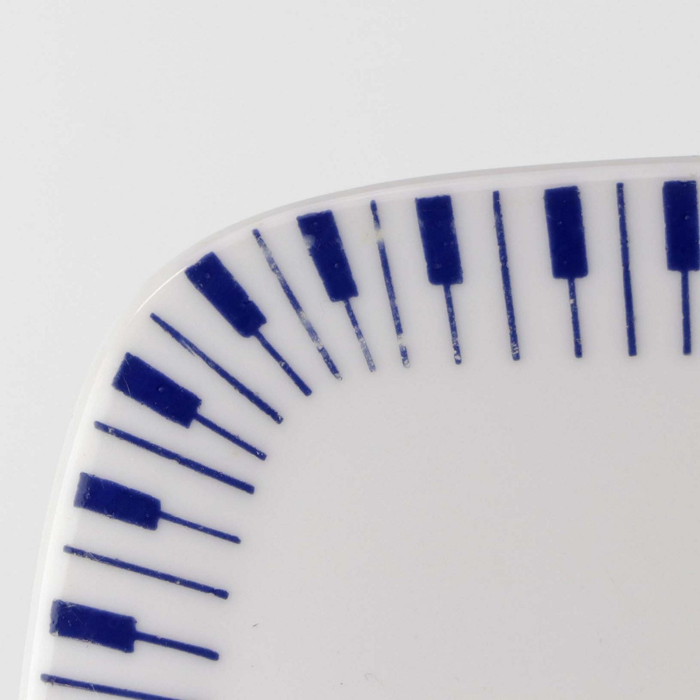 Stellet er fremstillet i ildfast glat porcelæn dekoreret med mørkeblå tangenter på hvid baggrund.