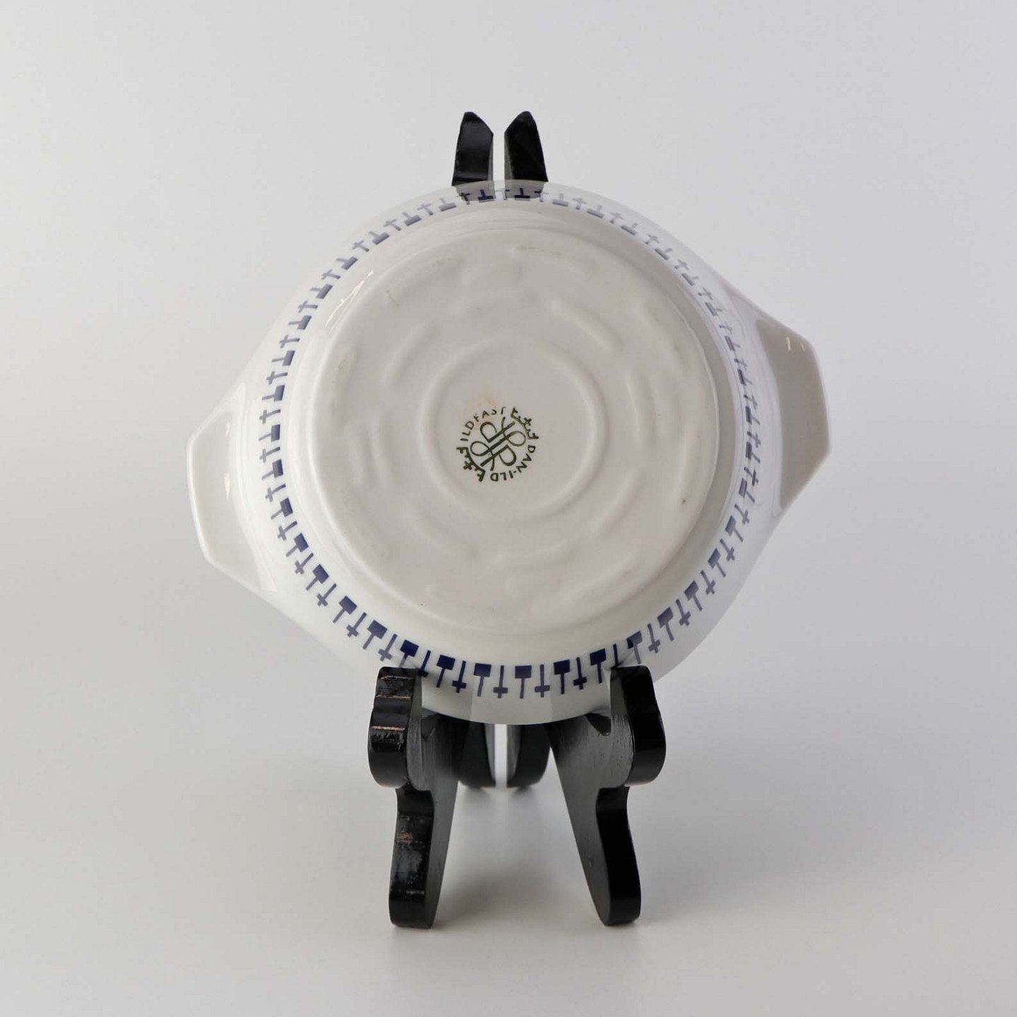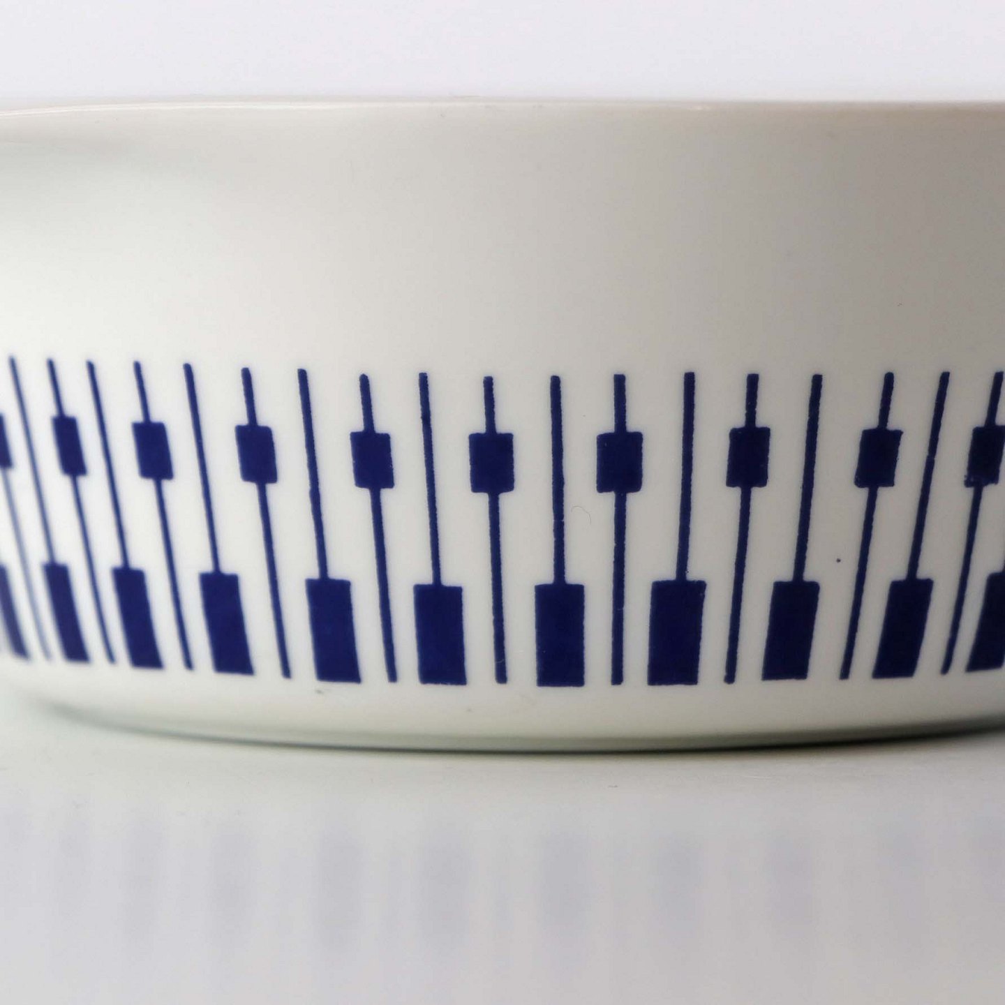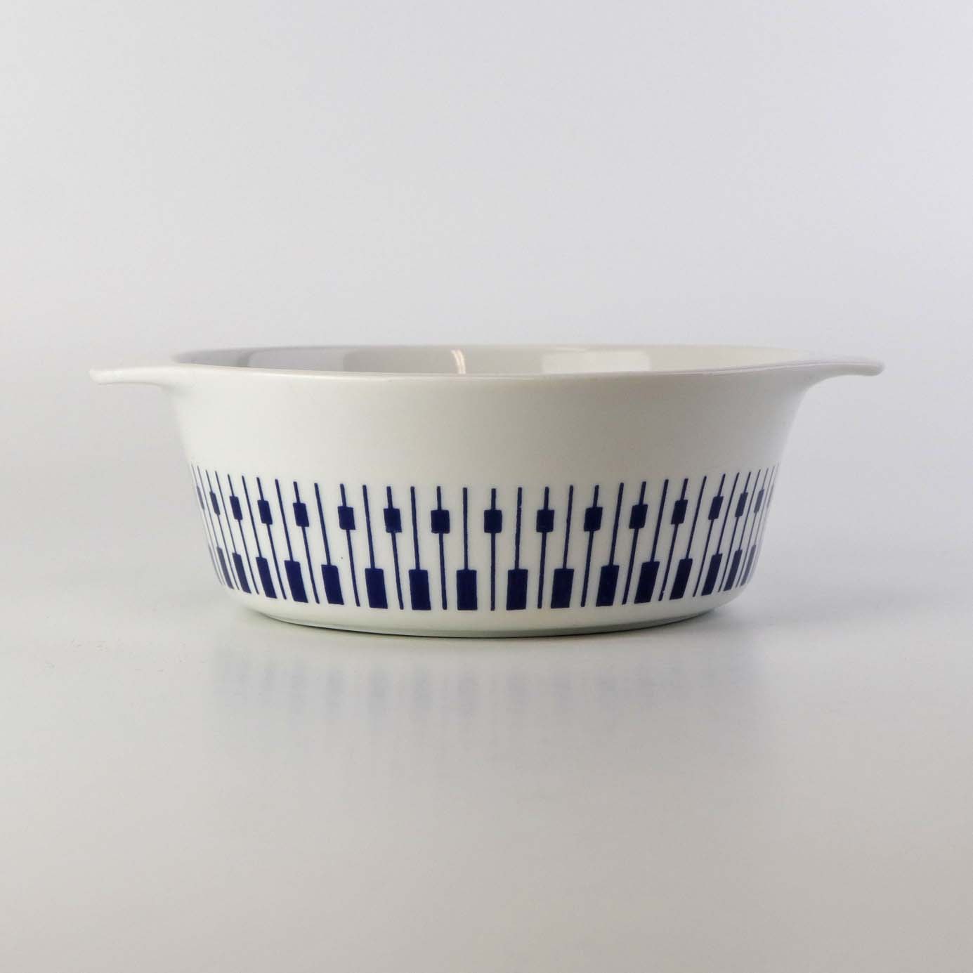 Stellet er fremstillet i ildfast glat porcelæn dekoreret med mørkeblå tangenter på hvid baggrund.
