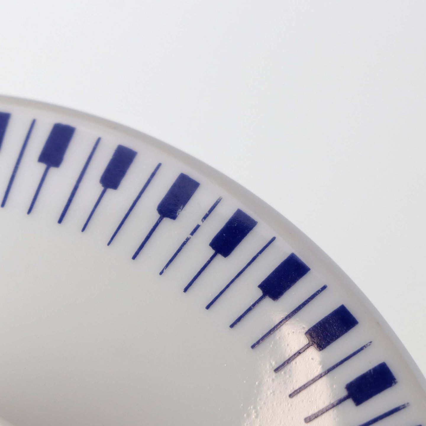 Stellet er fremstillet i ildfast glat porcelæn dekoreret med mørkeblå tangenter på hvid baggrund.