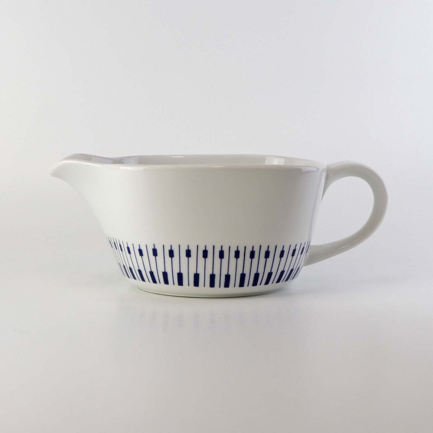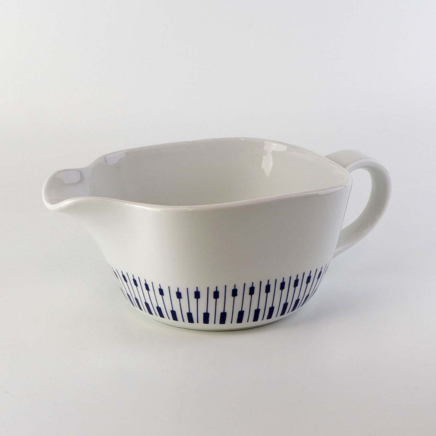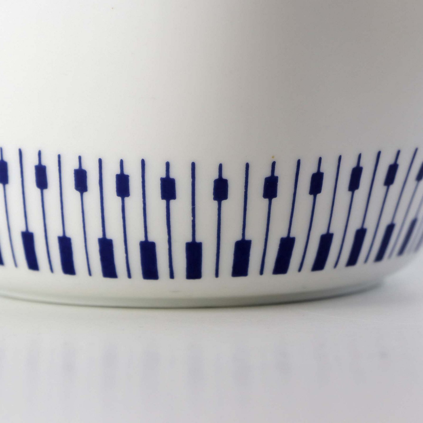 Stellet er fremstillet i ildfast glat porcelæn dekoreret med mørkeblå tangenter på hvid baggrund.