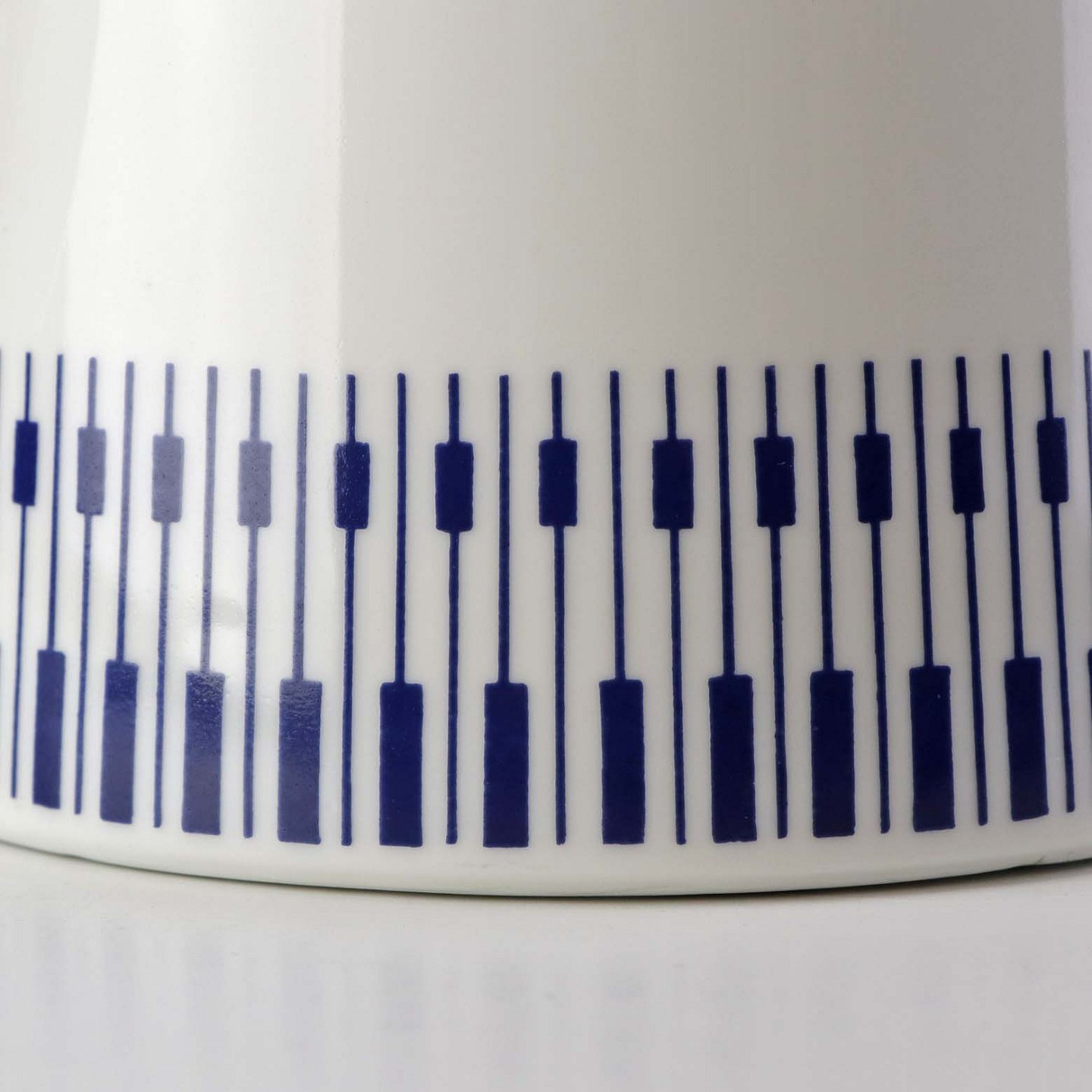 Stellet er fremstillet i ildfast glat porcelæn dekoreret med mørkeblå tangenter på hvid baggrund.