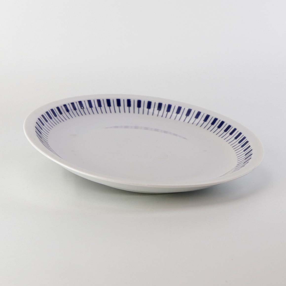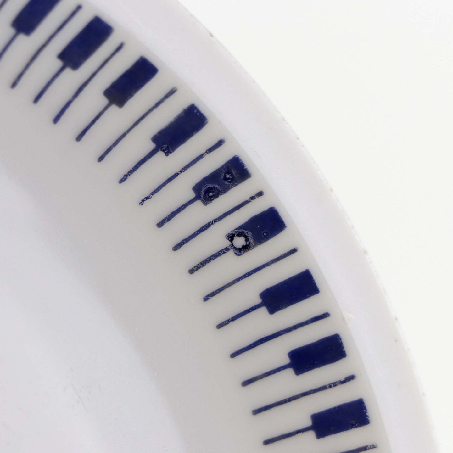 Stellet er fremstillet i ildfast glat porcelæn dekoreret med mørkeblå tangenter på hvid baggrund.