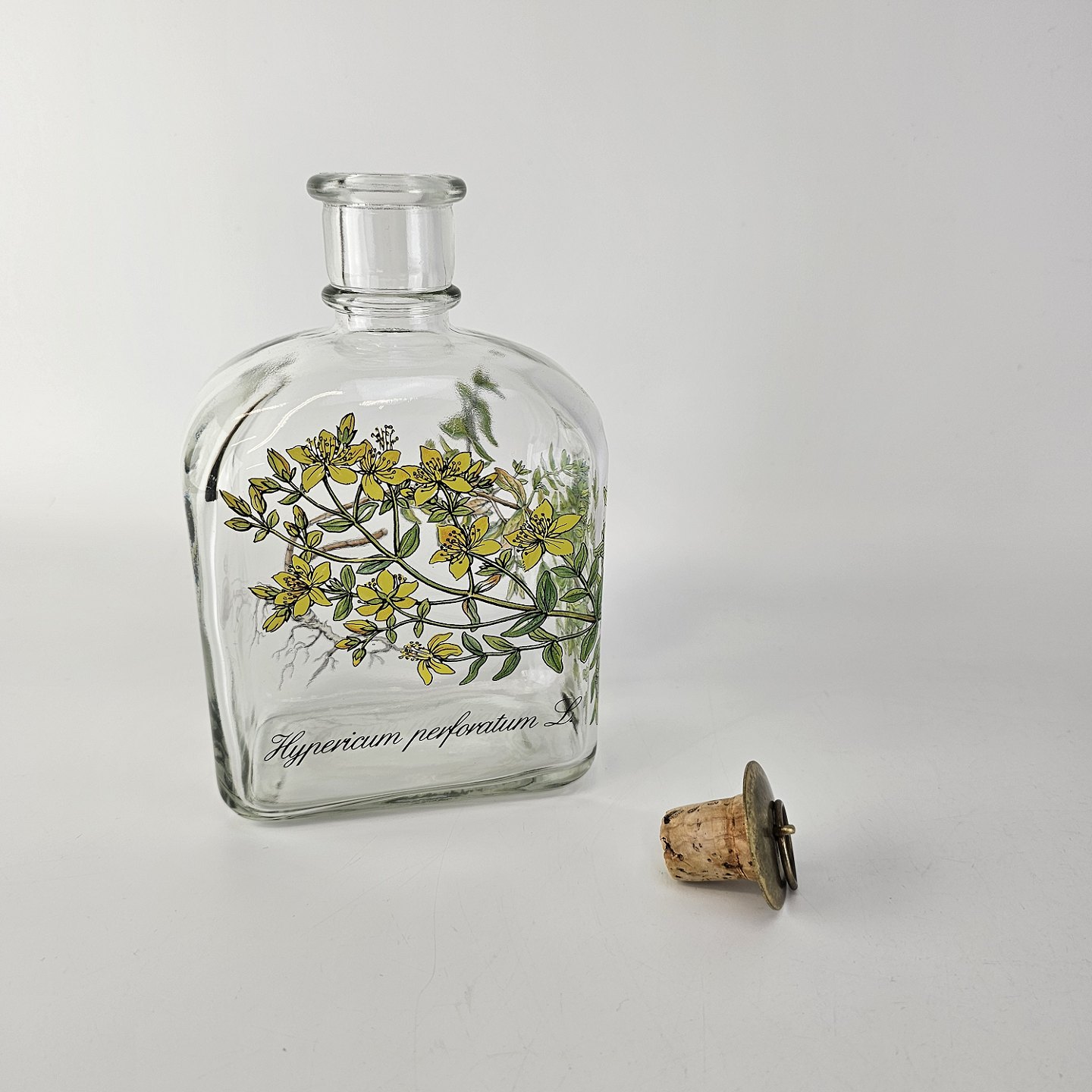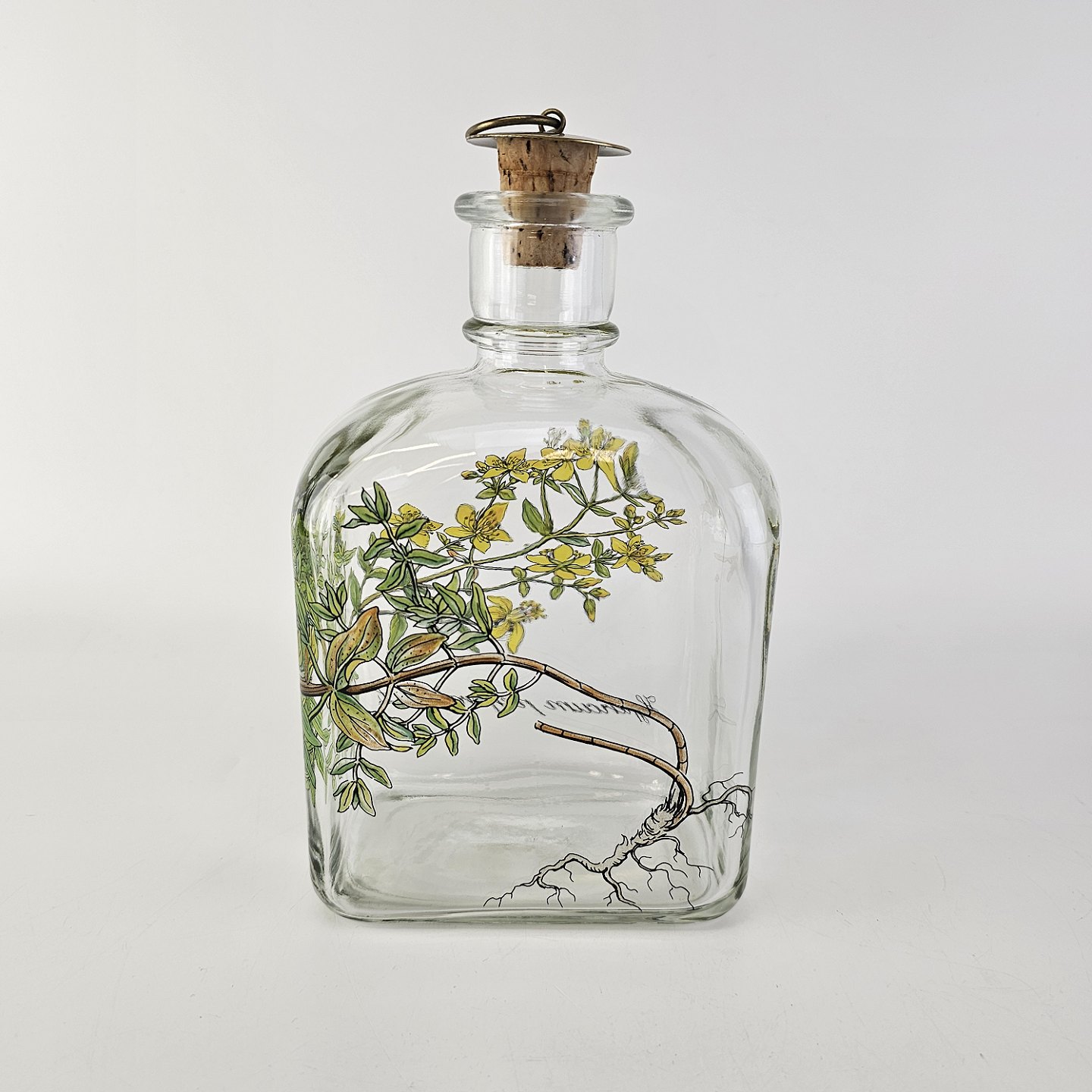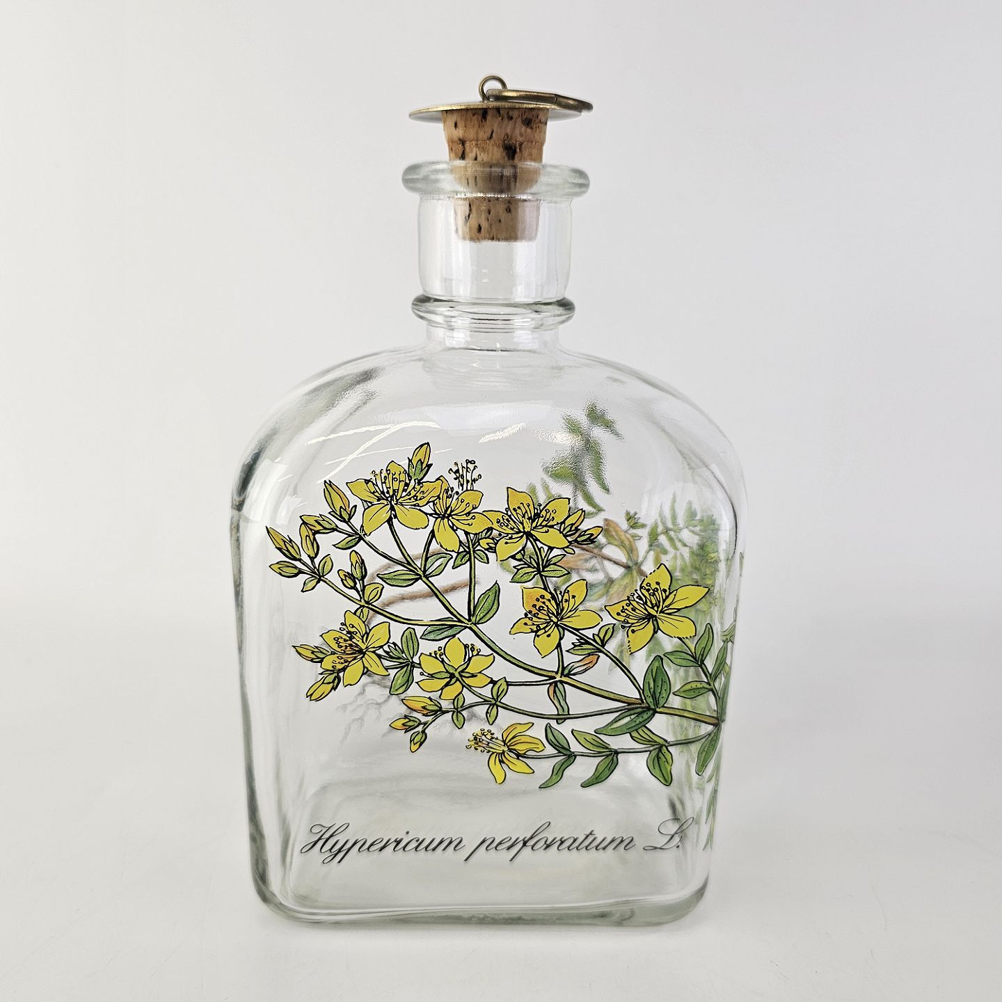 Karaffel i klart glas med korkprop fra serien Brændevins Amatøren, dekoreret med en gren af prikbladet perikum blomster og teksten Hypericum Perforatum L.