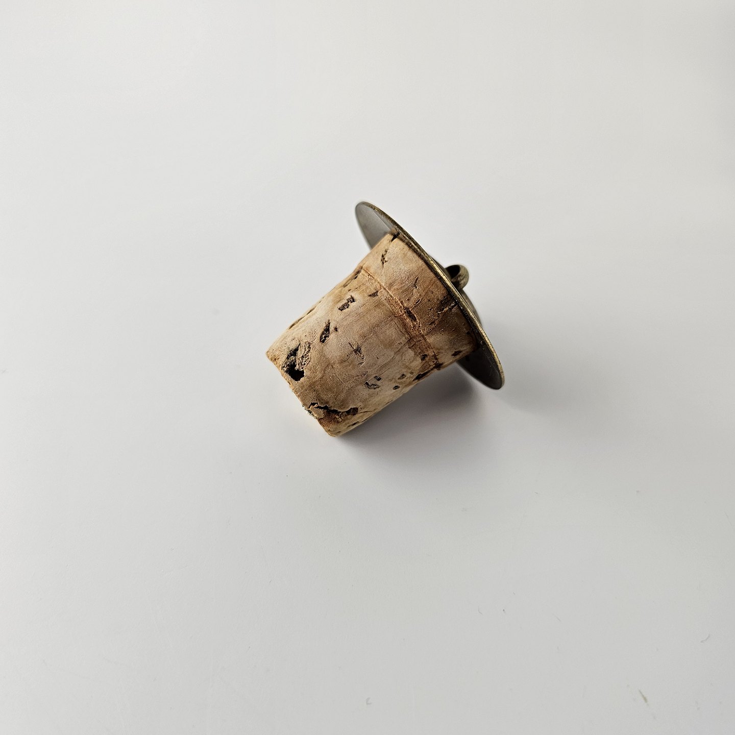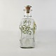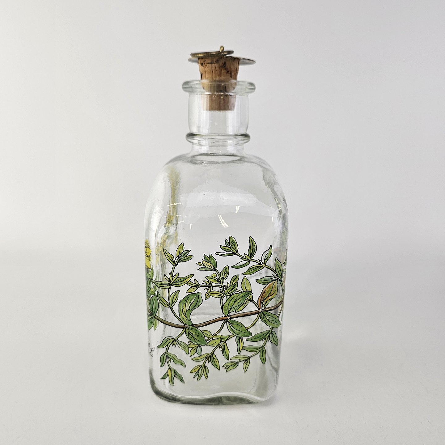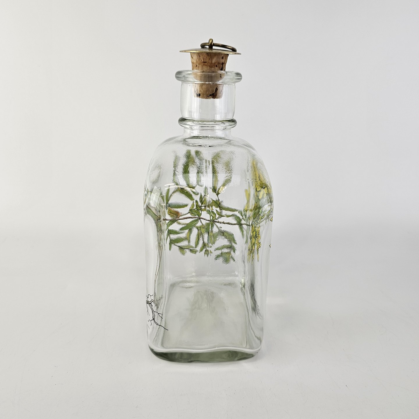 Karaffel i klart glas med korkprop fra serien Brændevins Amatøren, dekoreret med en gren af prikbladet perikum blomster og teksten Hypericum Perforatum L.