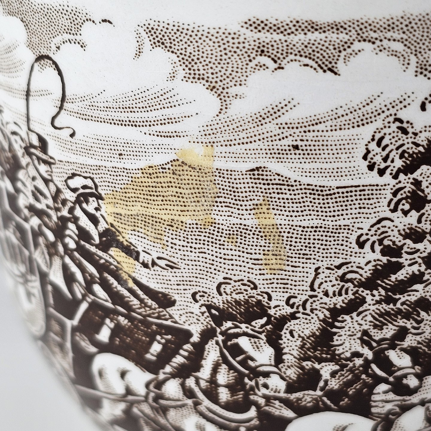 Stor kop og underkop i engelsk fajance fra stellet Coaching Taverns 1828