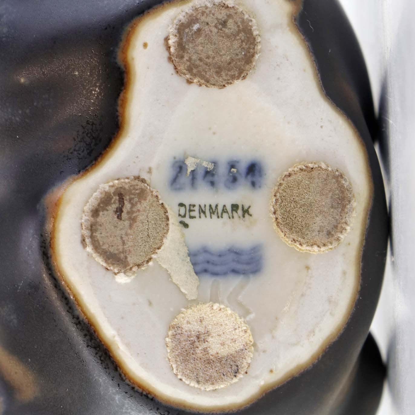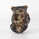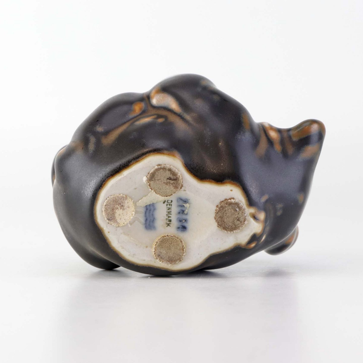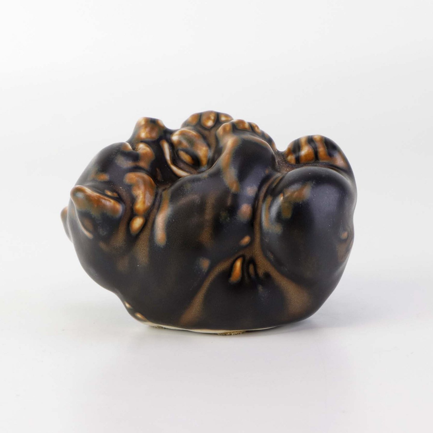 Figur i brunglaseret stentøj med motiv af liggende bjørneunge med pote i munden. Nr. 21434