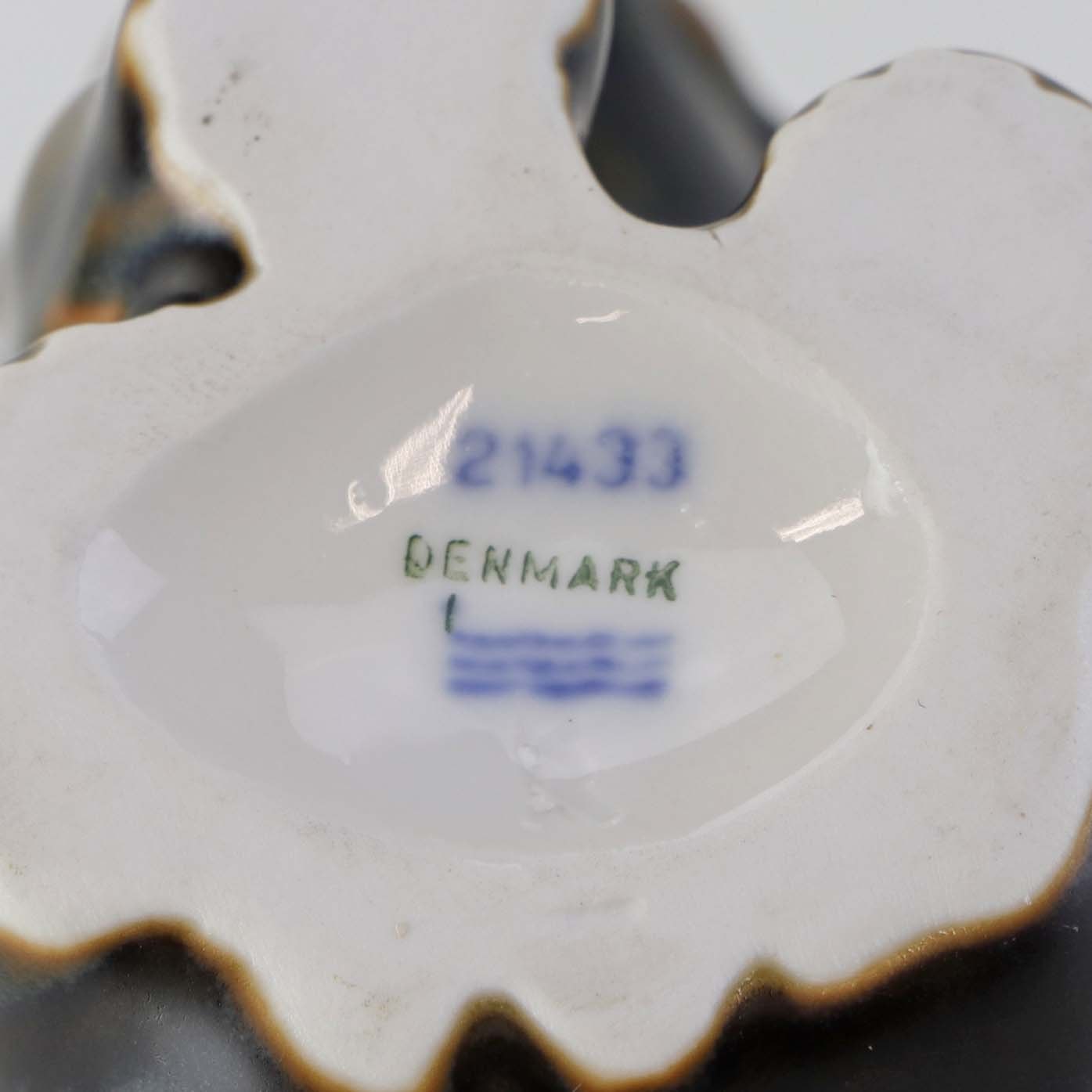 Figur i brunglaseret stentøj med motiv af siddende bjørneunge med løftet pote. Nr. 21433