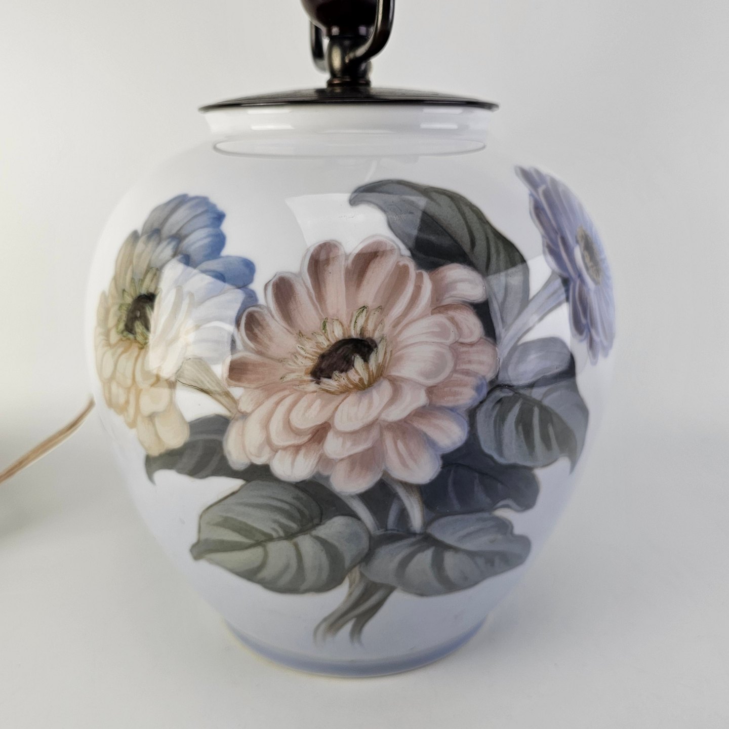 Bordlampe i hvidt porcelæn med dekoration af blomster og sommerfugle, og fatning i sort metal