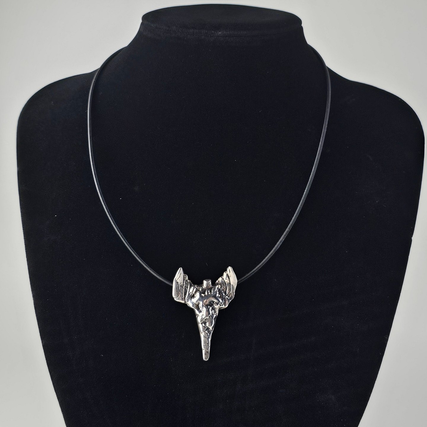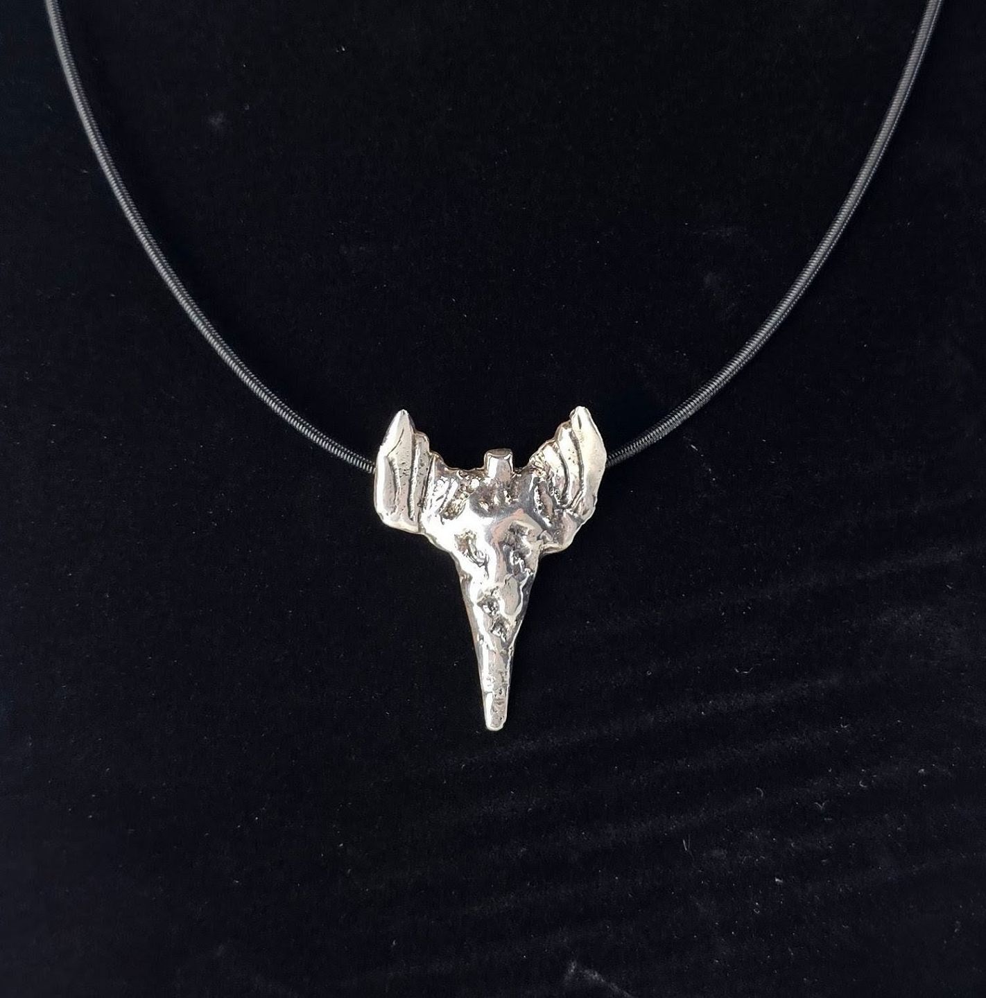 Halssmykke i sterling sølv med motiv af en abstrakt engel og læderrem, smykket er kaldet Nibe Englen