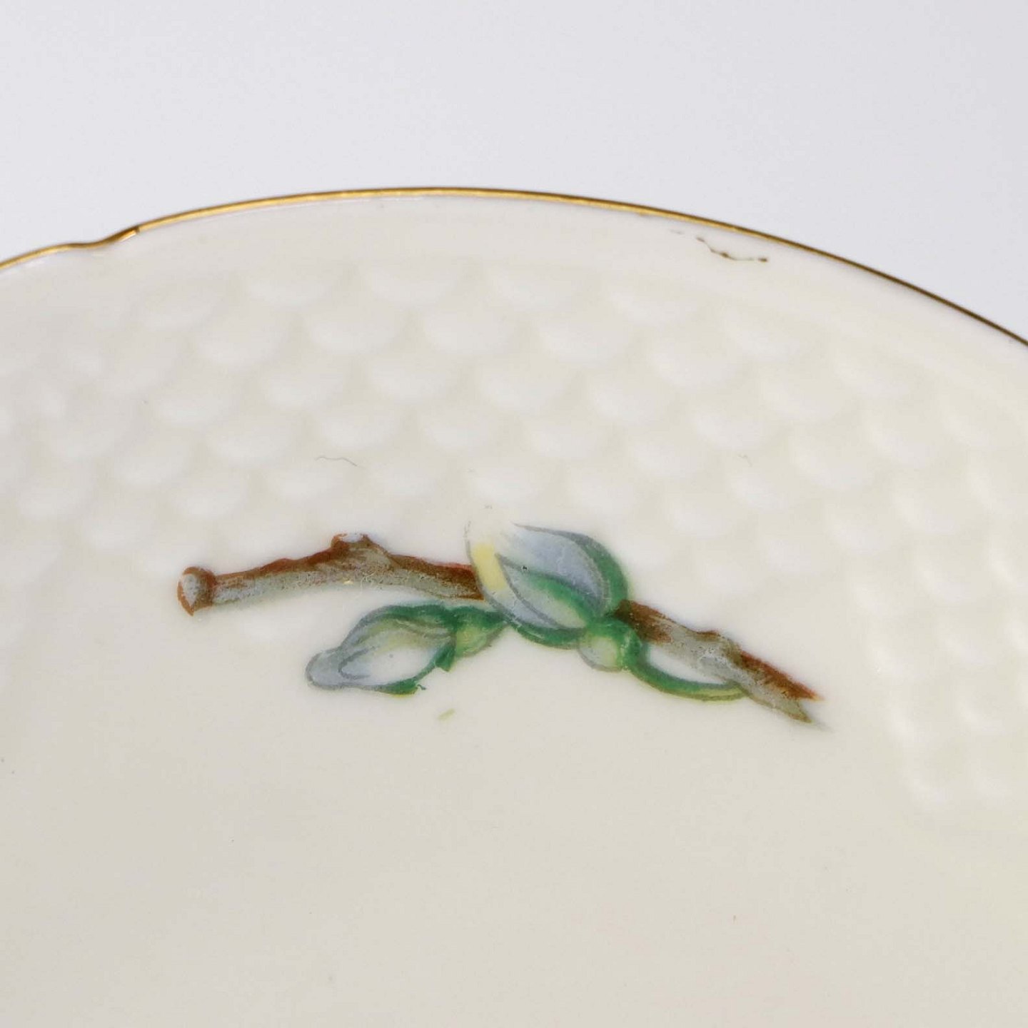 Heimdal er cremefarvet porcelæn i skælform, som dekoreret med jasminblomster, grene og en guldkant.