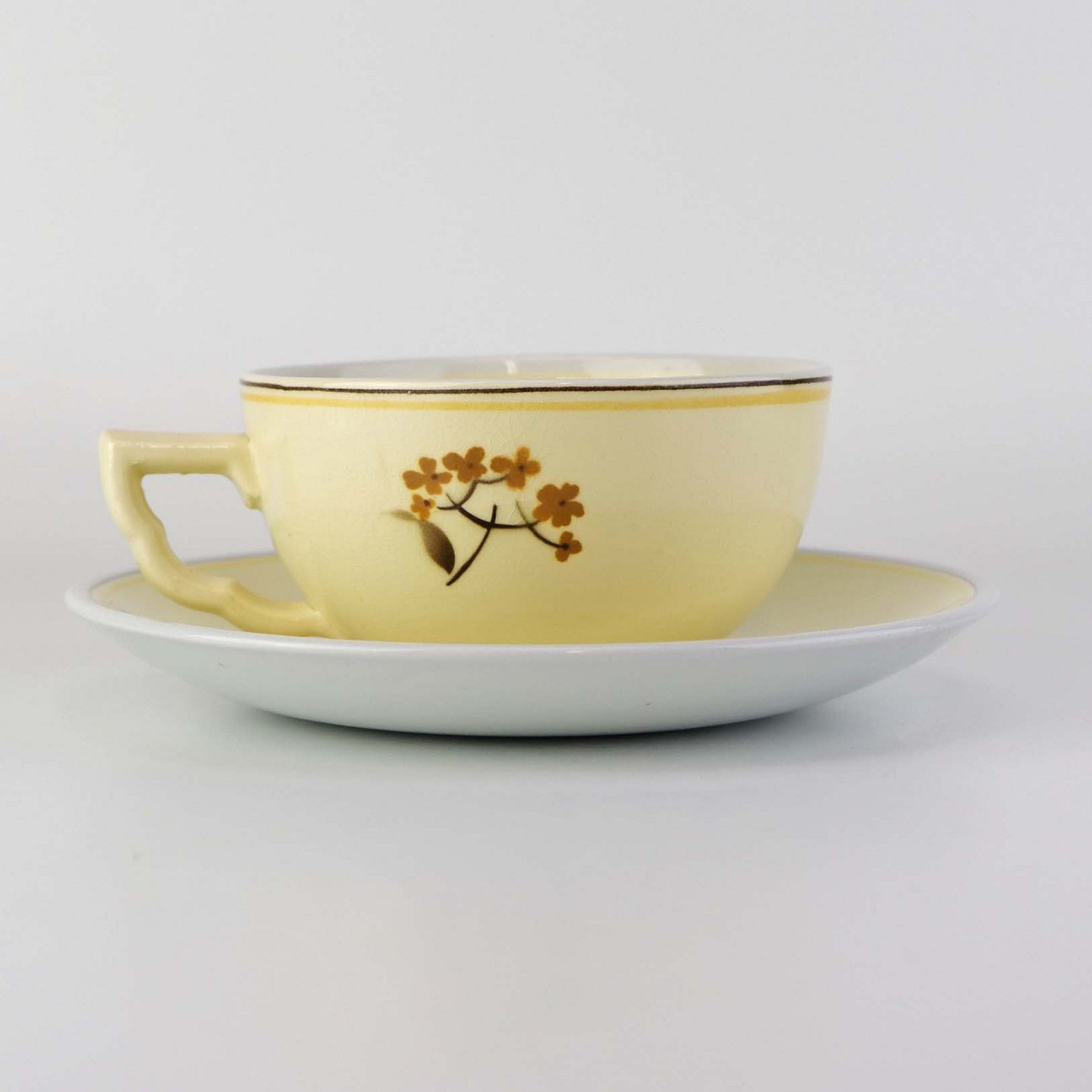 Stel i glat gul fajance med dekoration af farverige og forskelligartede blomster samt med gul og sort kantstreg.