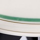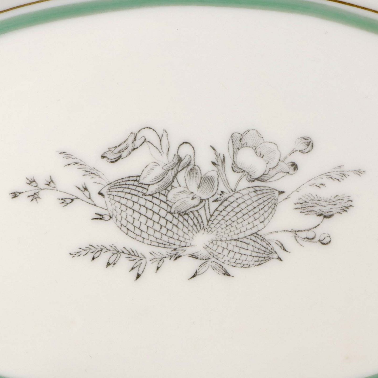 Service i glat cremefarvet porcelæn med grøn og sort kantstreg samt dekoration af blomster og grene i sort streg.