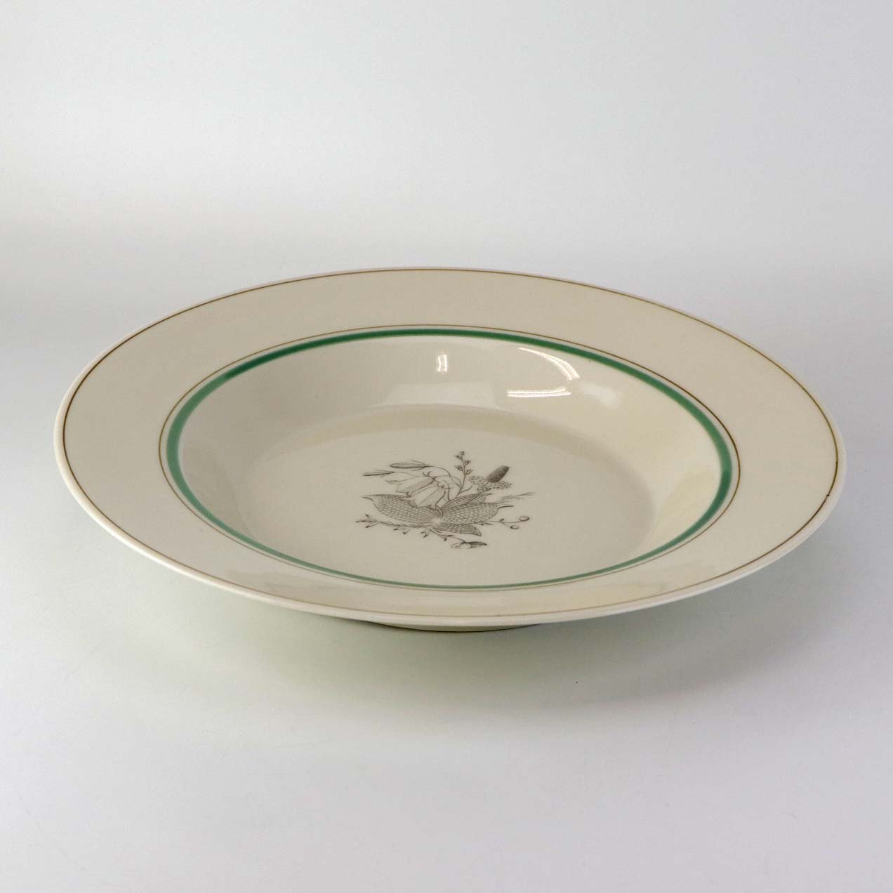 Service i glat cremefarvet porcelæn med grøn og sort kantstreg samt dekoration af blomster og grene i sort streg.