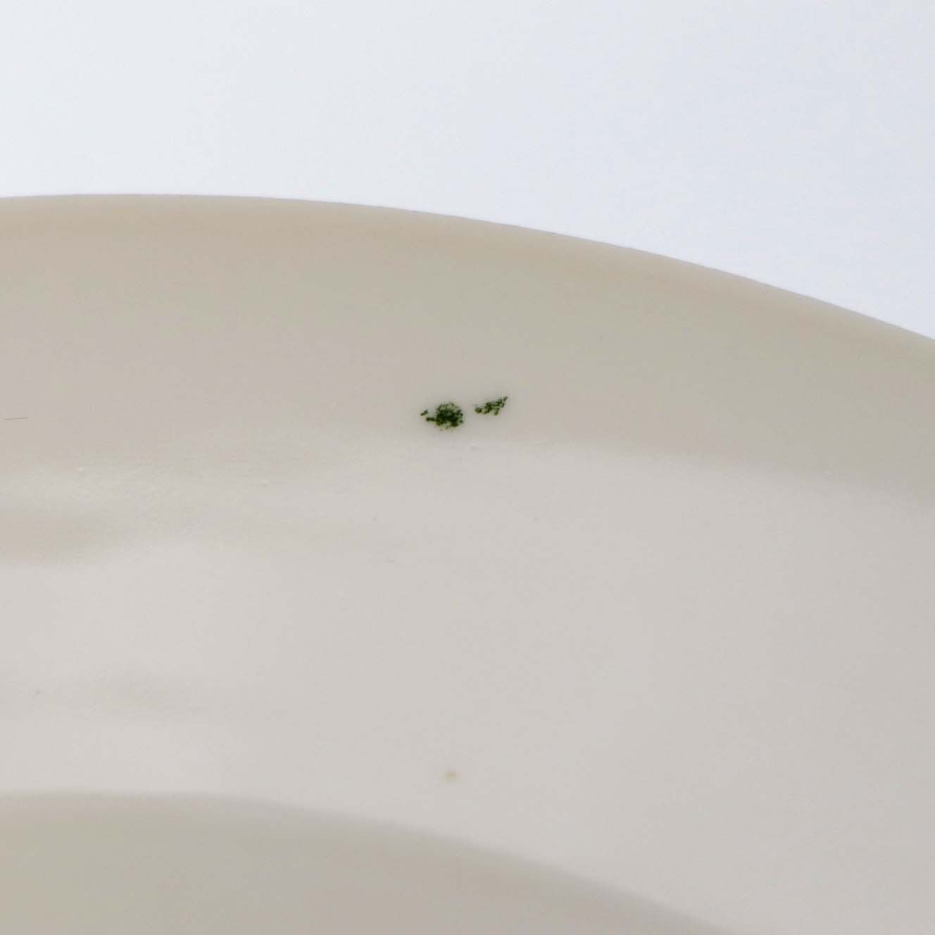 Fremstår med minimalt nøk ved bundkanten, mindre brune pletter under glasuren samt ujævnhed enkelte steder ved kantstregen.