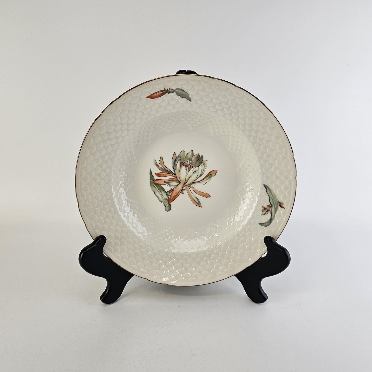 Kaktus er cremefarvet porcelæn i skælform, dekoreret med kaktusblomster og guldkant