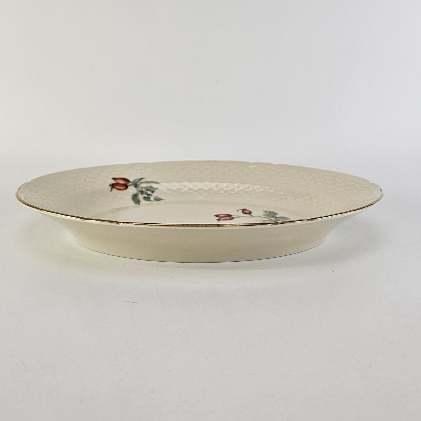 Balder er cremefarvet porcelæn i skælform, dekoreret med hyben og guldkant.