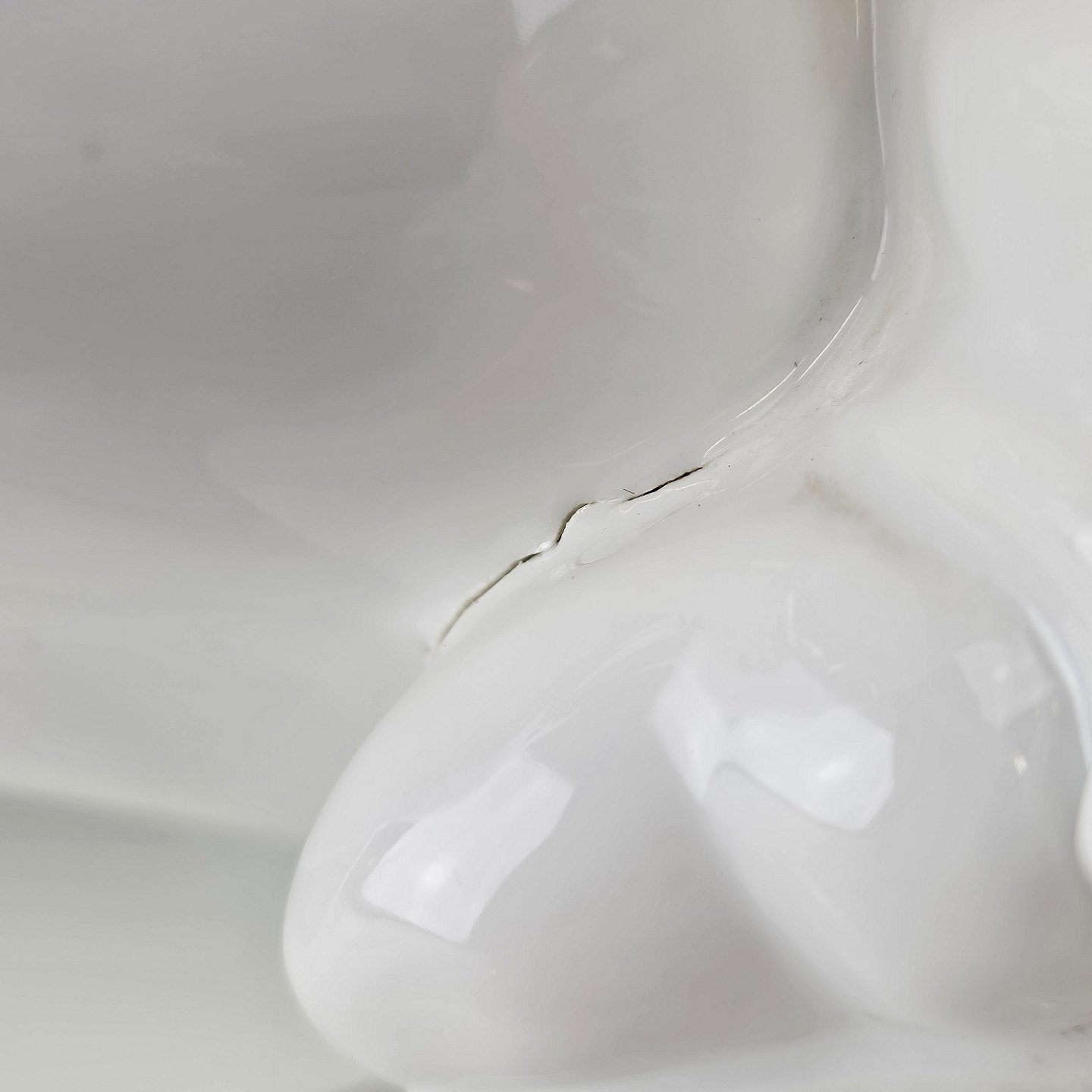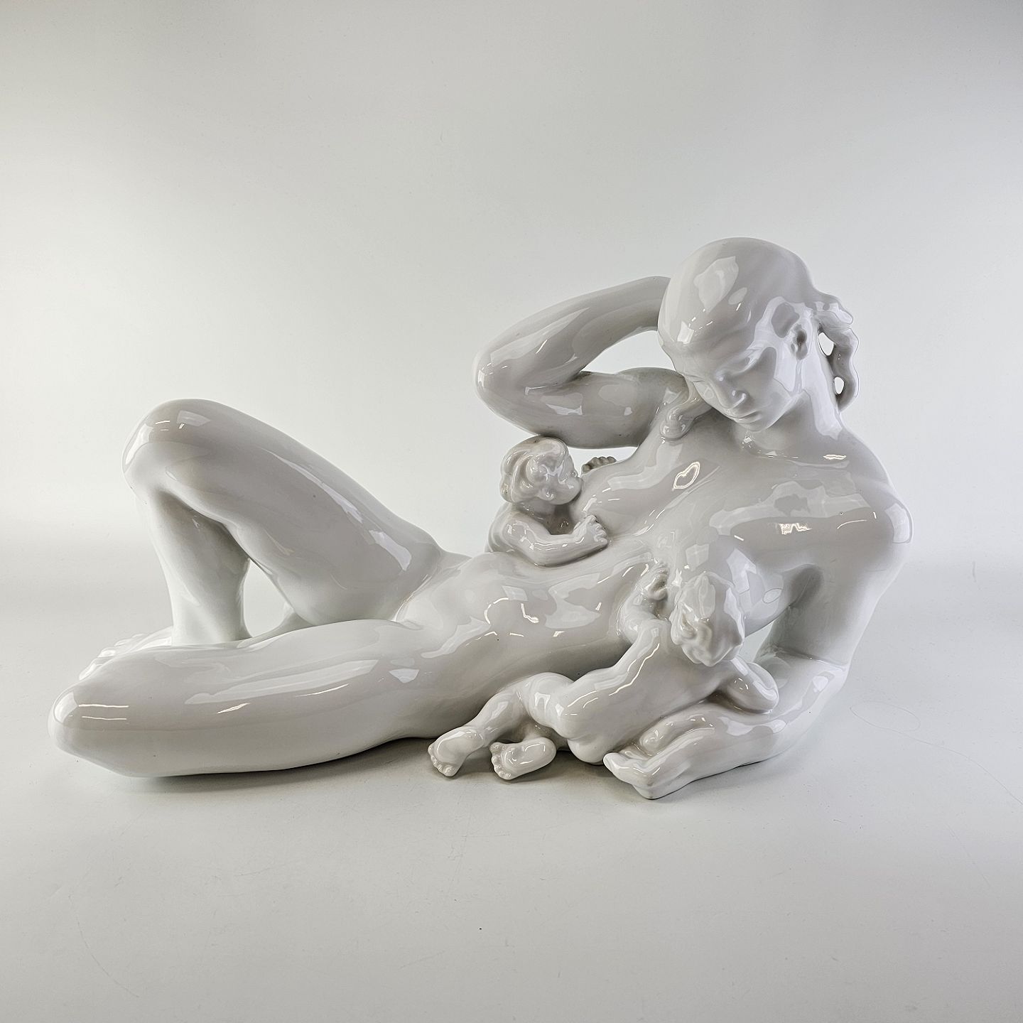 Figur i hvidt porcelæn med motiv af en kvinde som ligger med to små børn, kendt under navnene Vandmoderen og Caritas