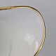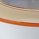Service i glat hvidt porcelæn pyntet med dekoration i beige, brændt orange og gylden streg.
