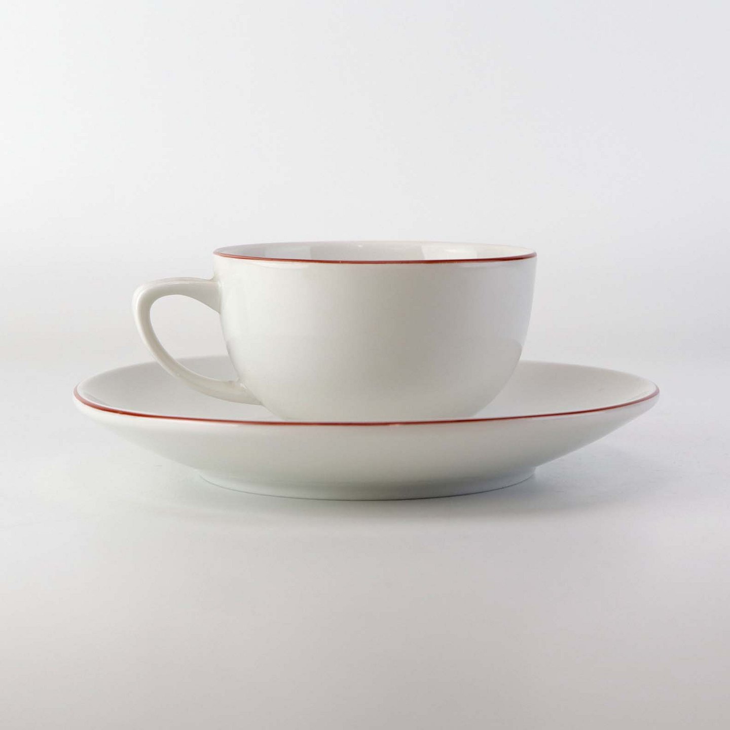 Service i glat hvidt porcelæn med dekoration i tynd rød streg.