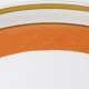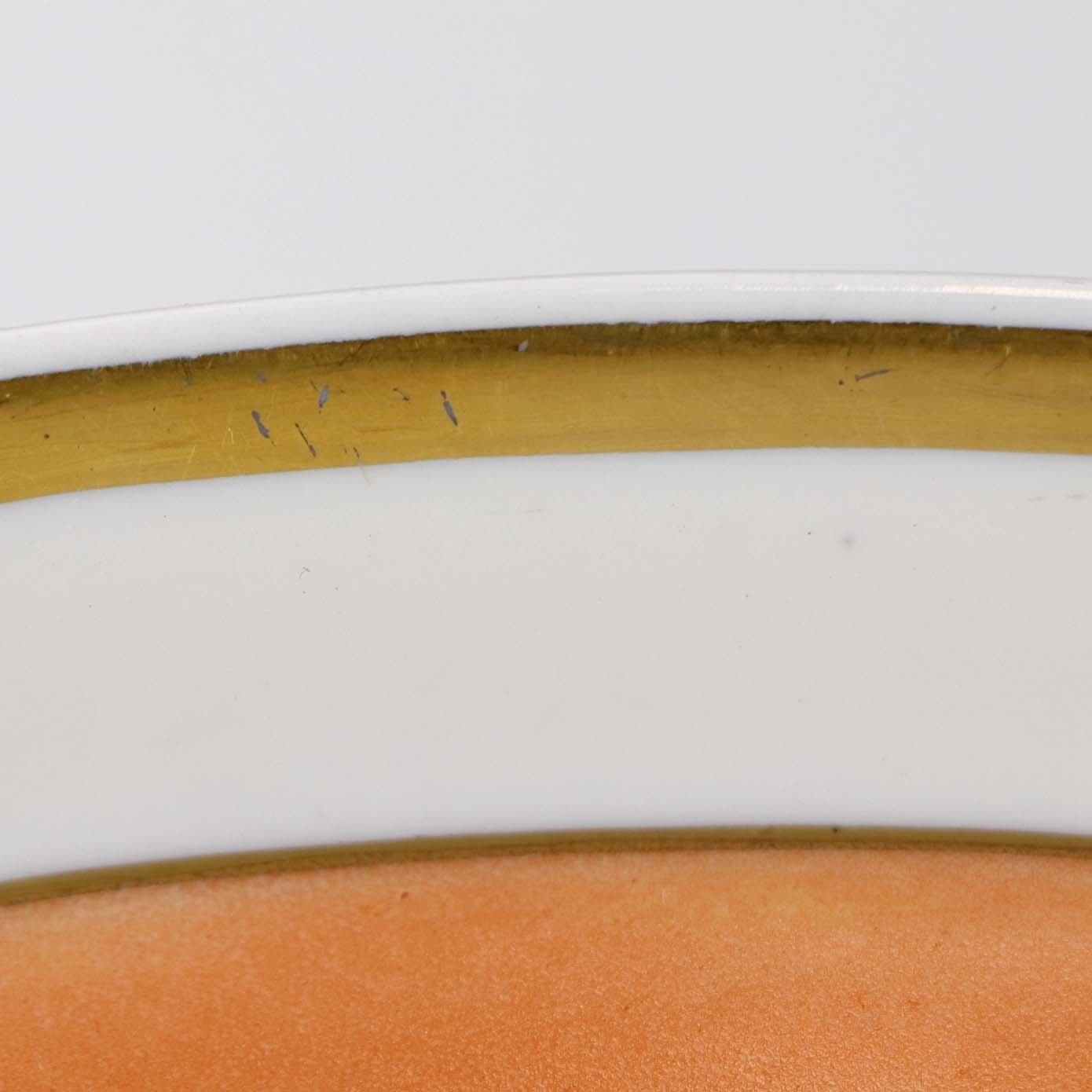 Service i glat hvidt porcelæn med orangerød dekoration over glasuren og guldkant