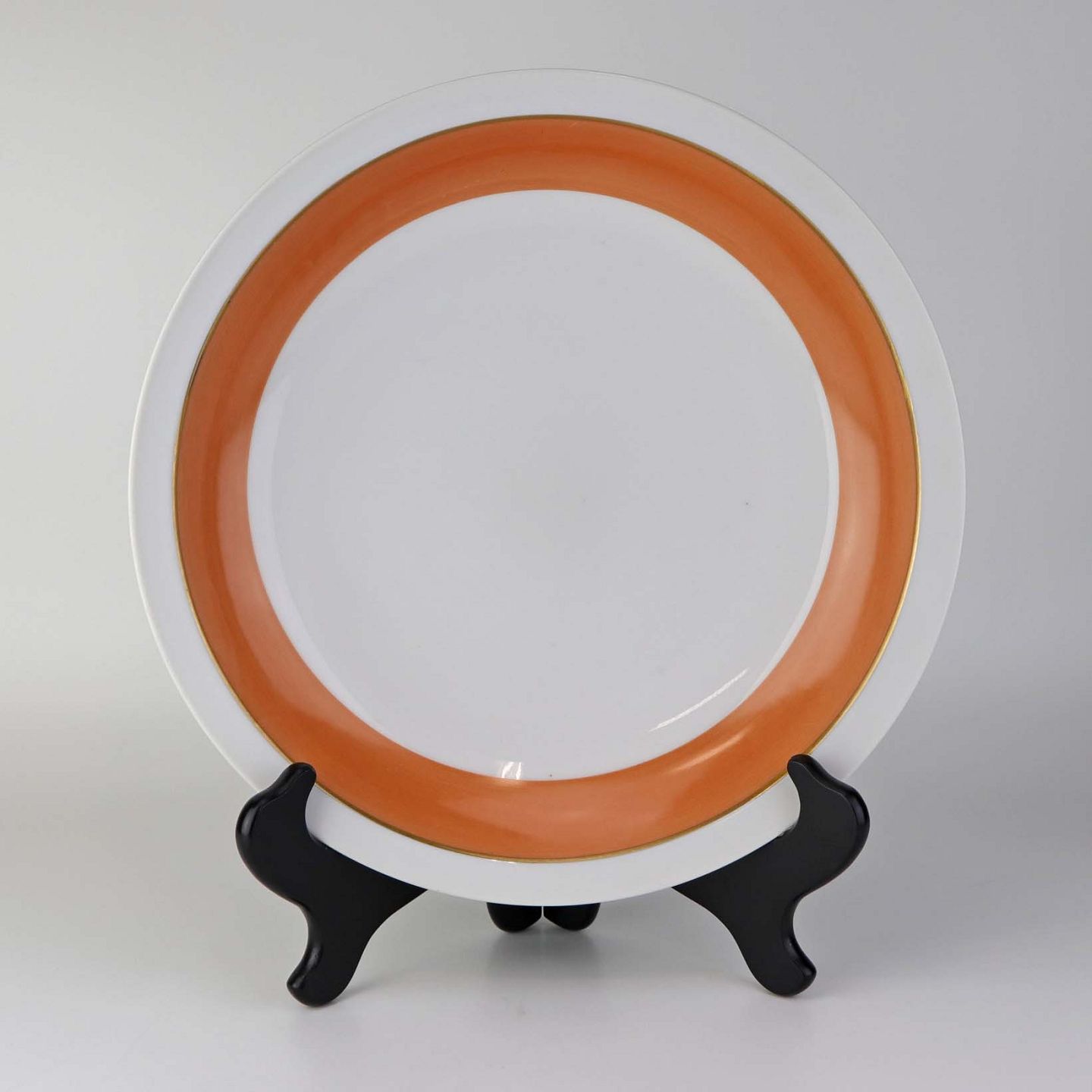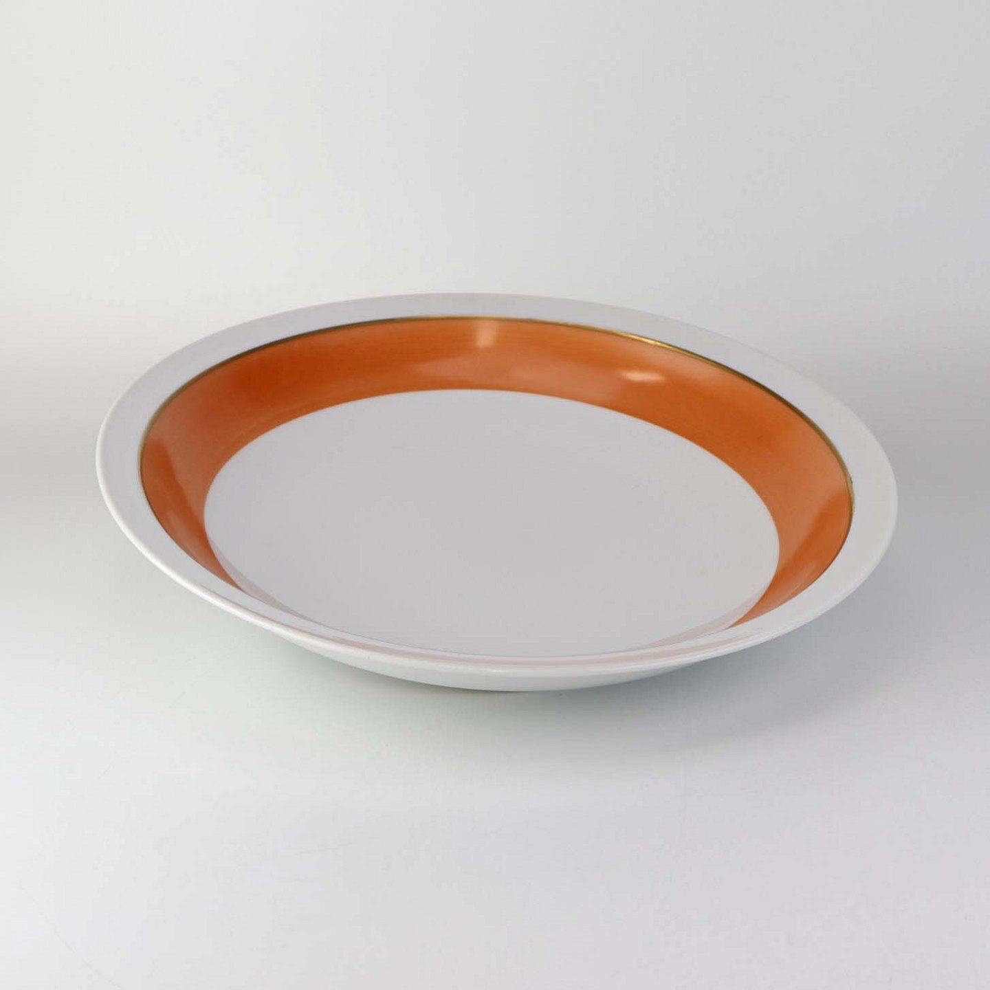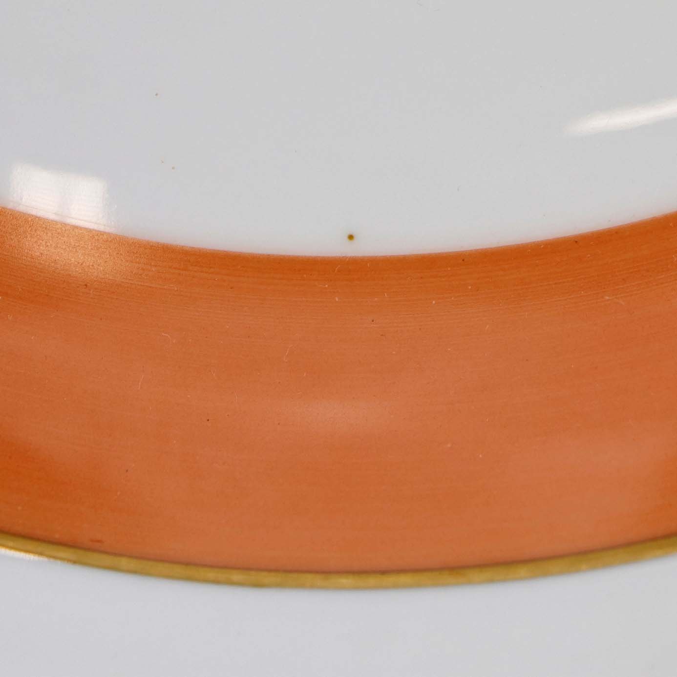 Service i glat hvidt porcelæn med orangerød dekoration over glasuren og guldkant