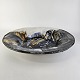 Stort rundt fad i glaseret keramik med abstrakt mønster i sorte, blå og brune nuancer