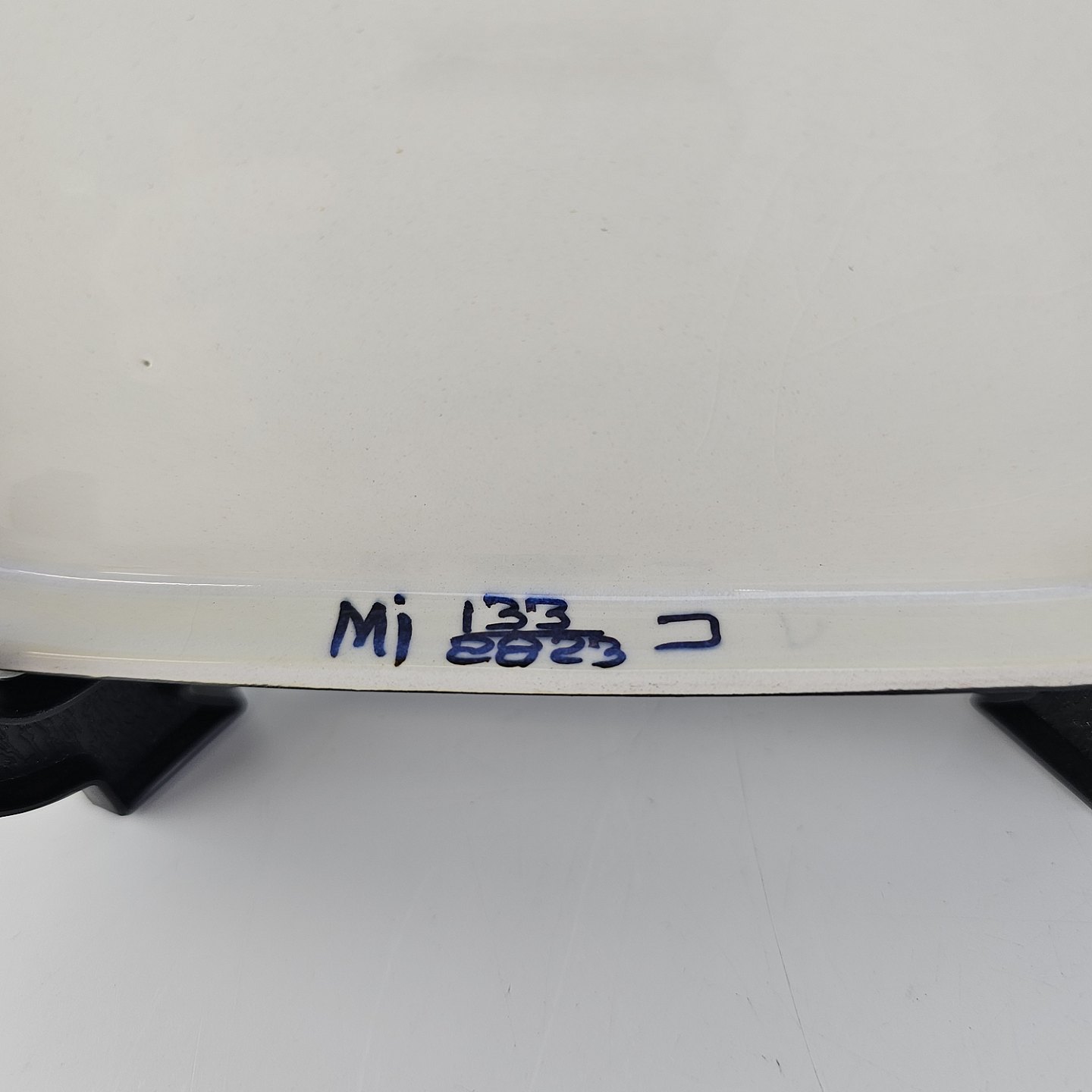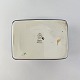 Smørboks fra serien Tenera. Boksen er i hvid fajance med blåmalet yderside og låget er dekoreret med motiv af en påfugl