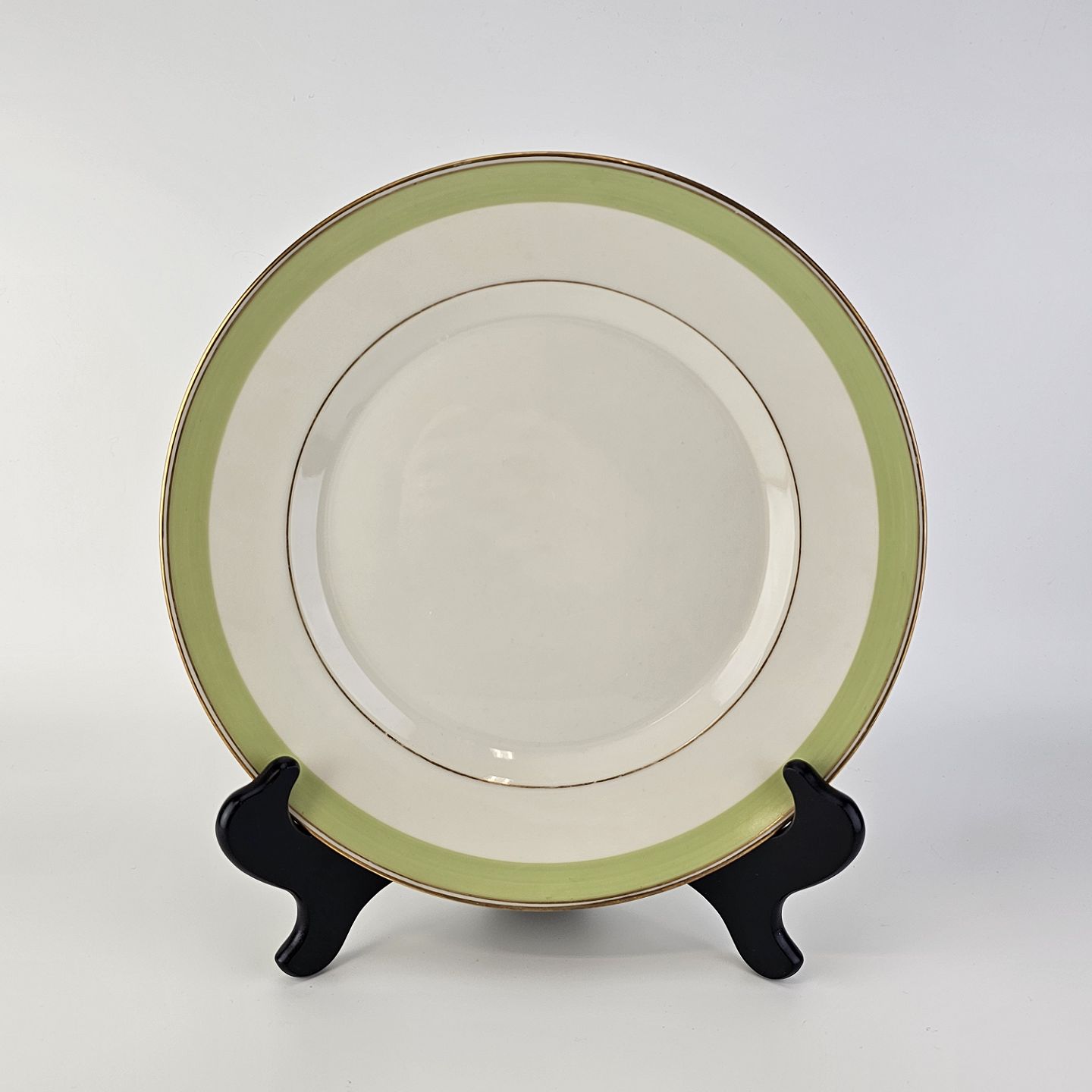 Stellet er fremstillet i glat cremefarvet porcelæn med lysegrøn dekoration og guldkant