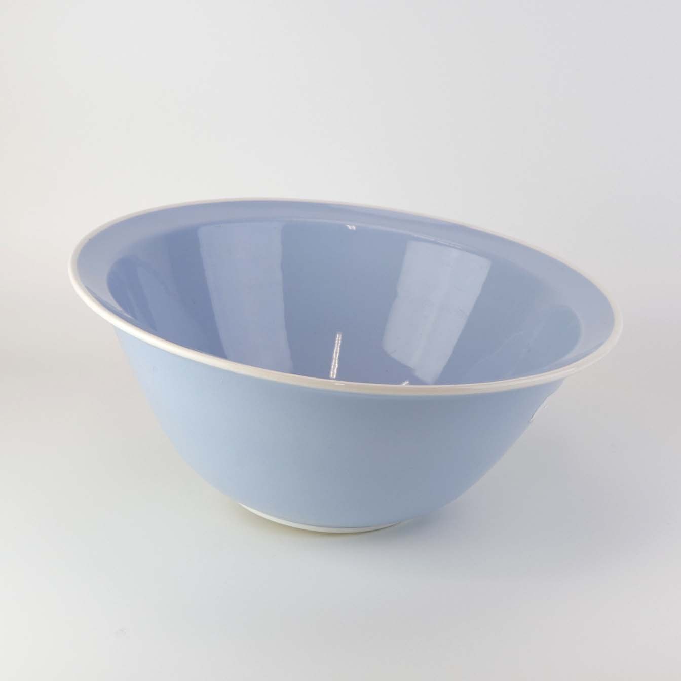 Service i lyseblå fajance dekoreret med tynd hvid kant.