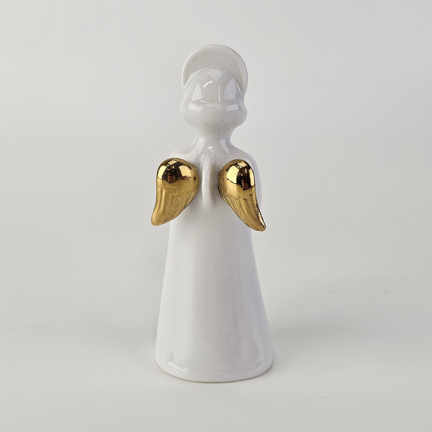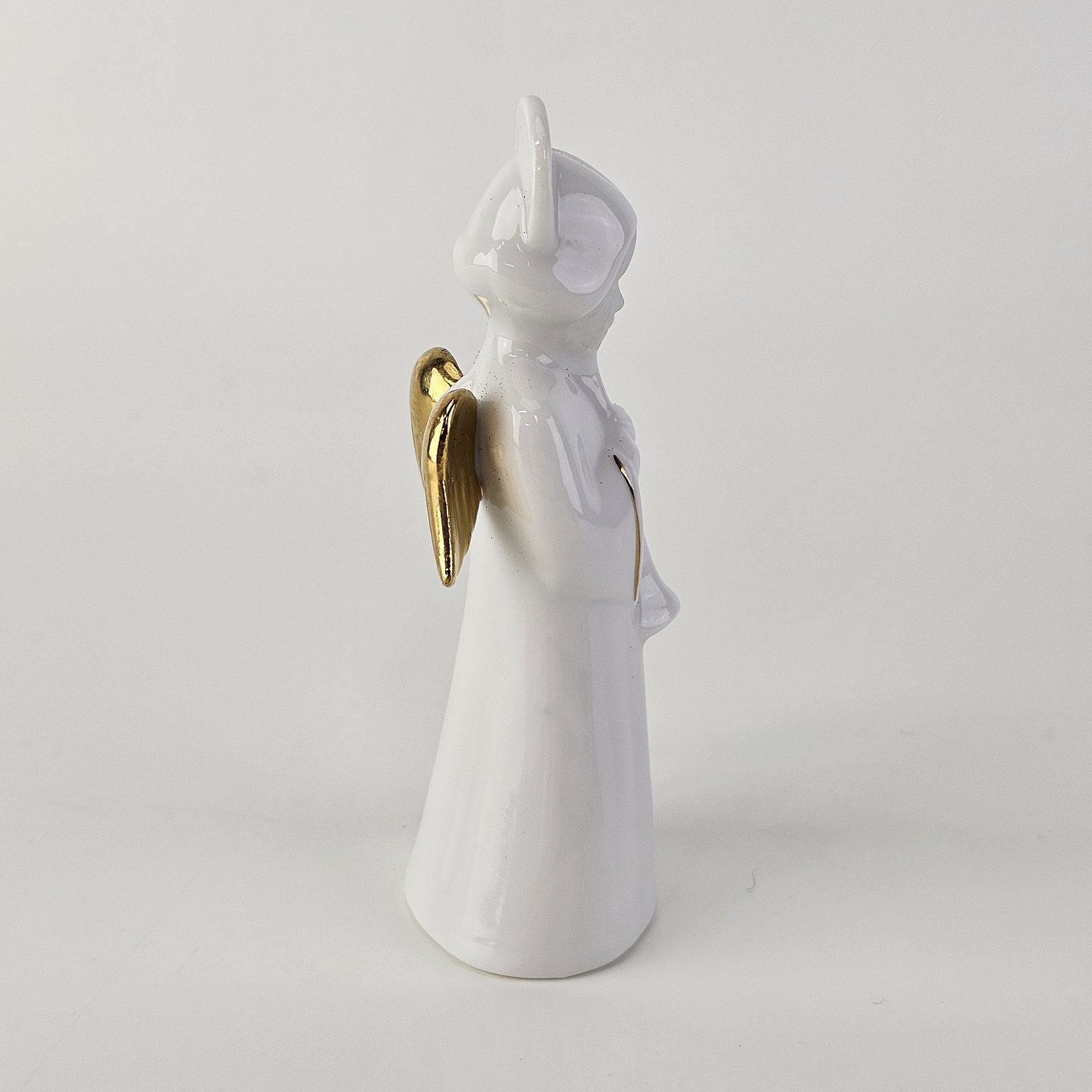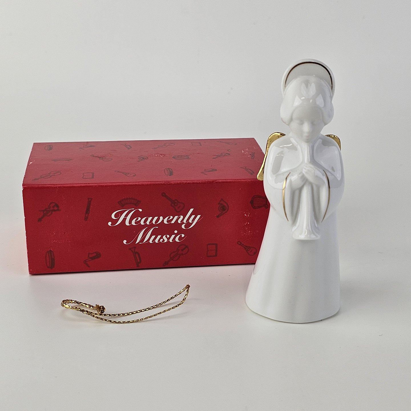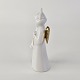 Figur med motiv af en engel som spiller på horn. Figuren er i hvidt porcelæn med forgyldte vinger og detaljer i 24 karat guld.