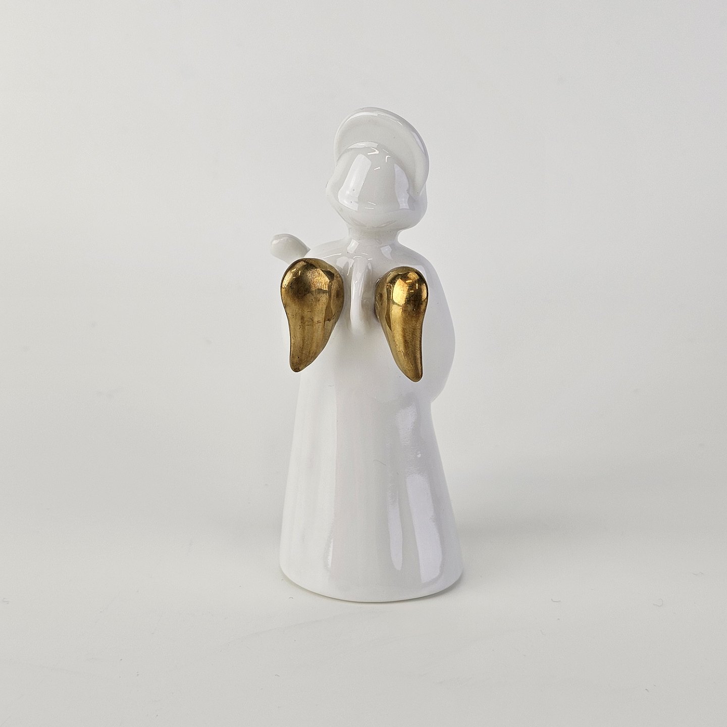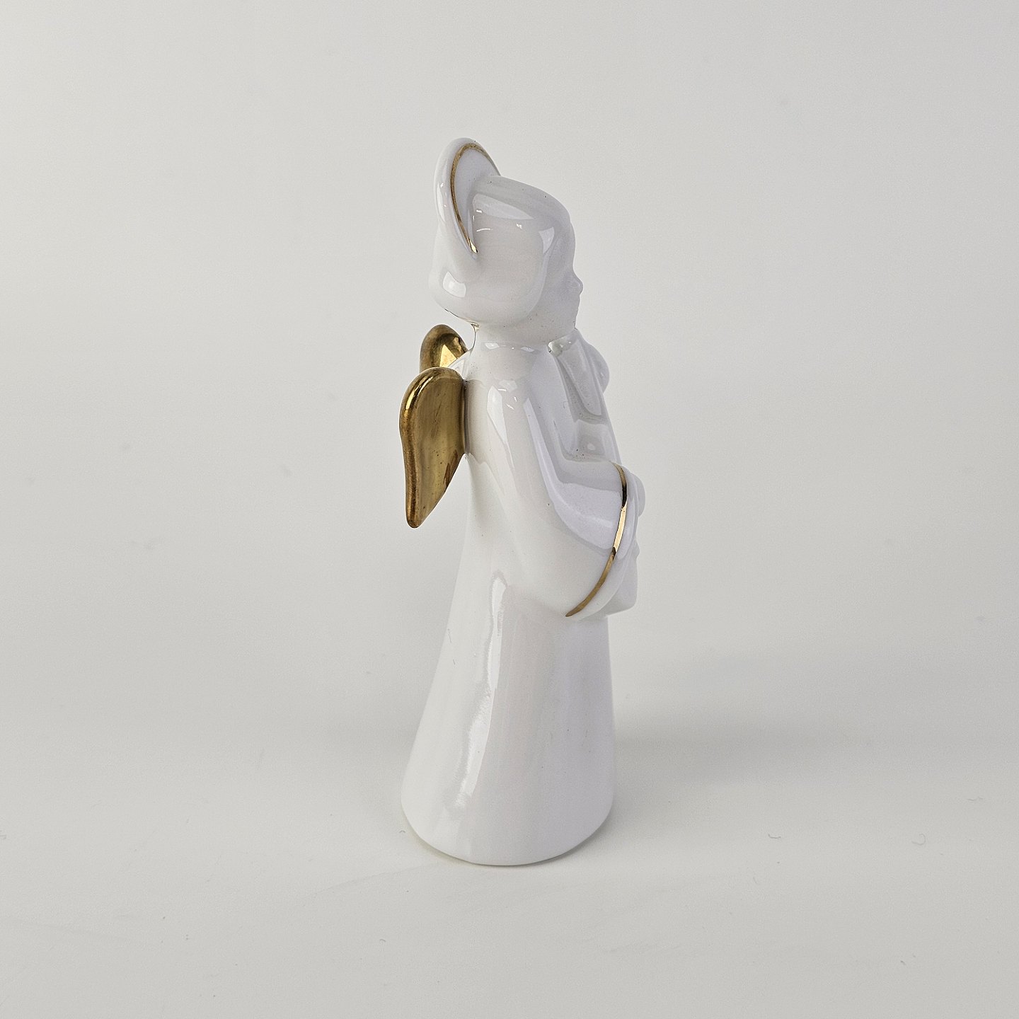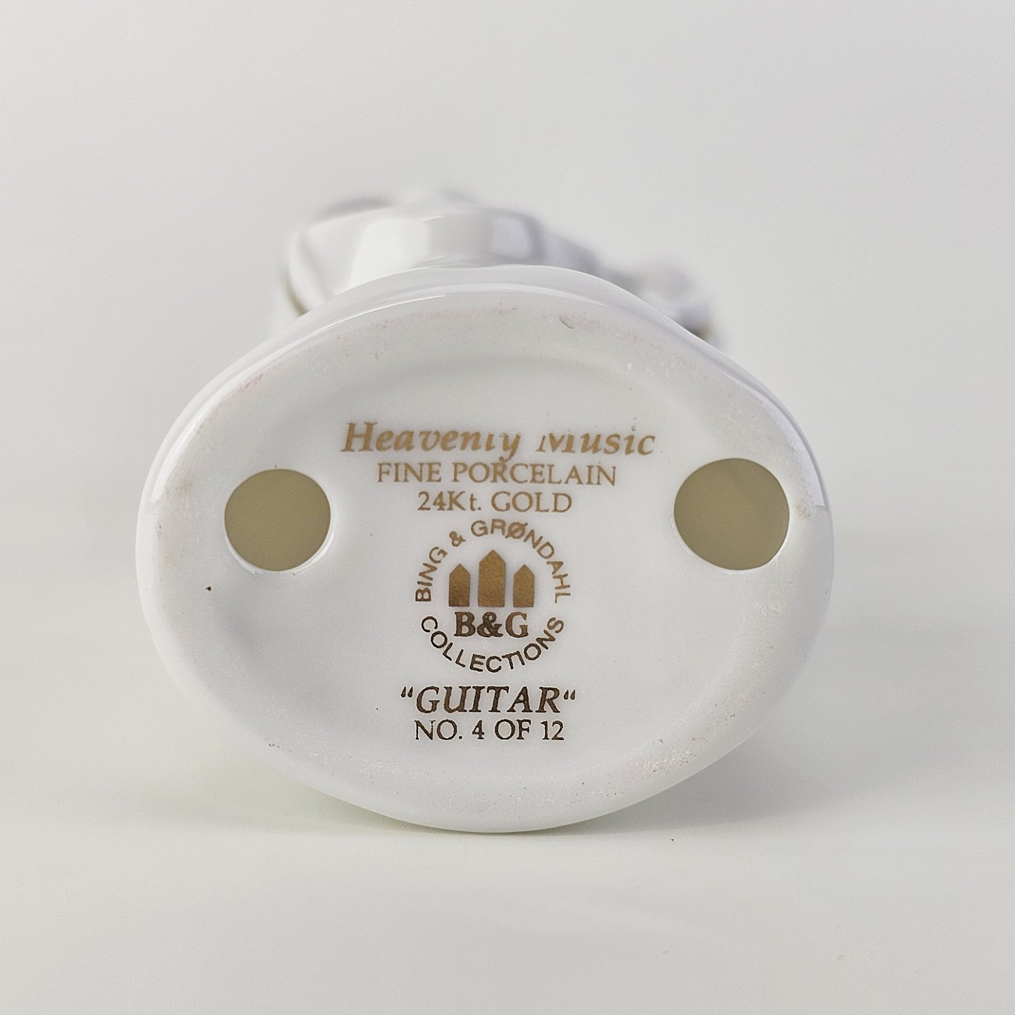 Figur med motiv af en engel som spiller på guitar. Figuren er i hvidt porcelæn med forgyldte vinger og detaljer i 24 karat guld.