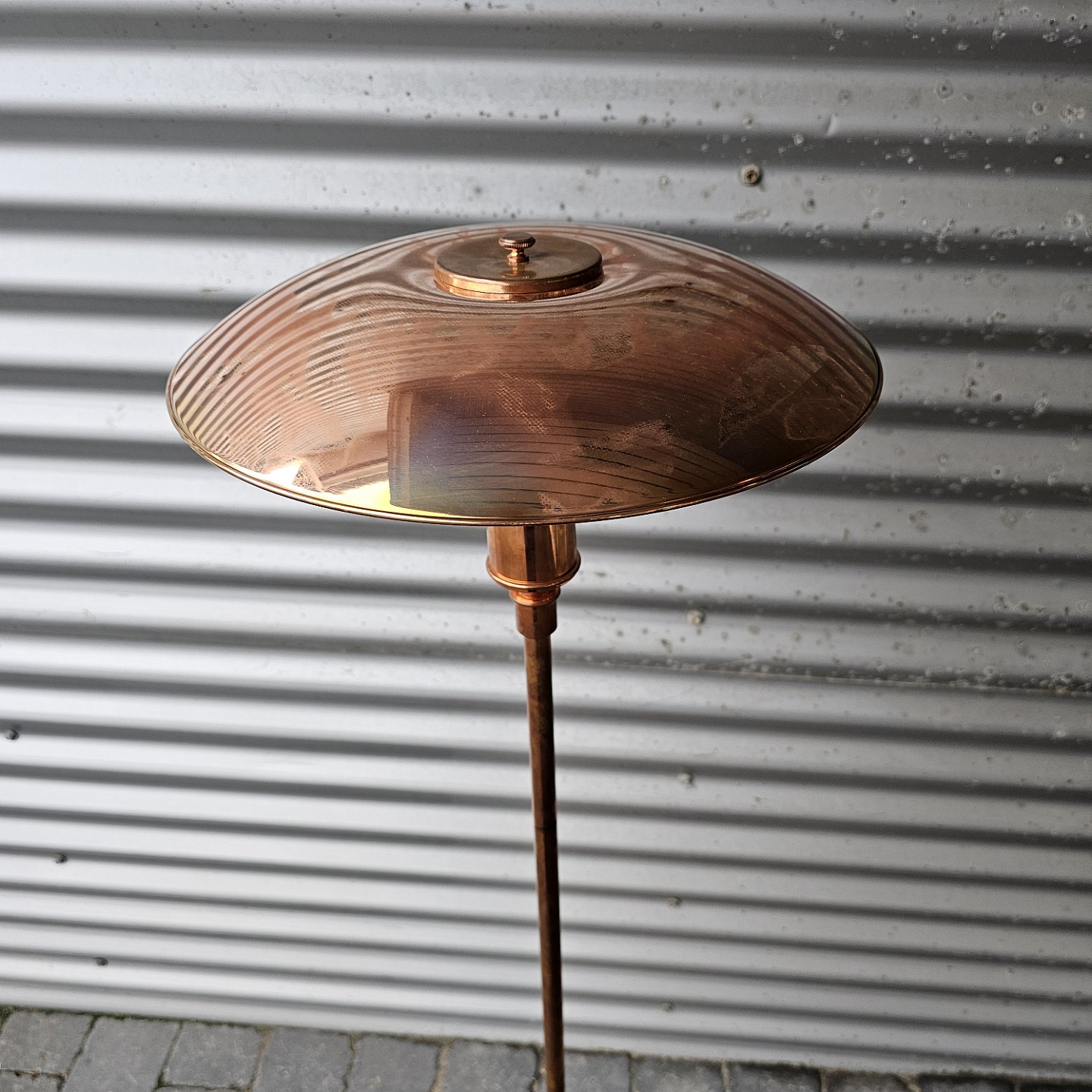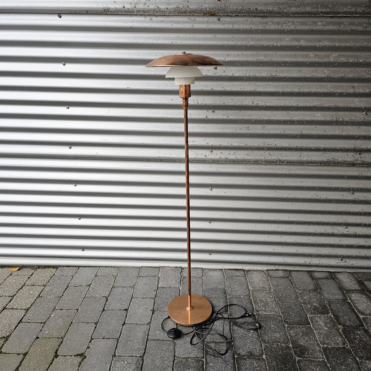 Gulvlampe i kobber og glas med overskærm af kobber