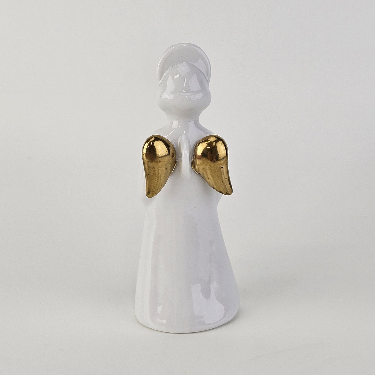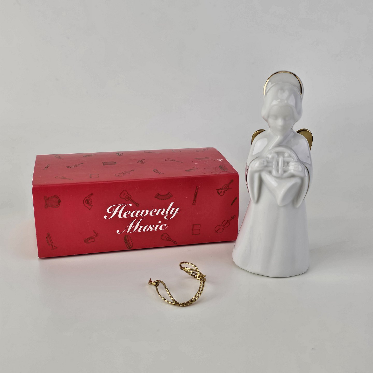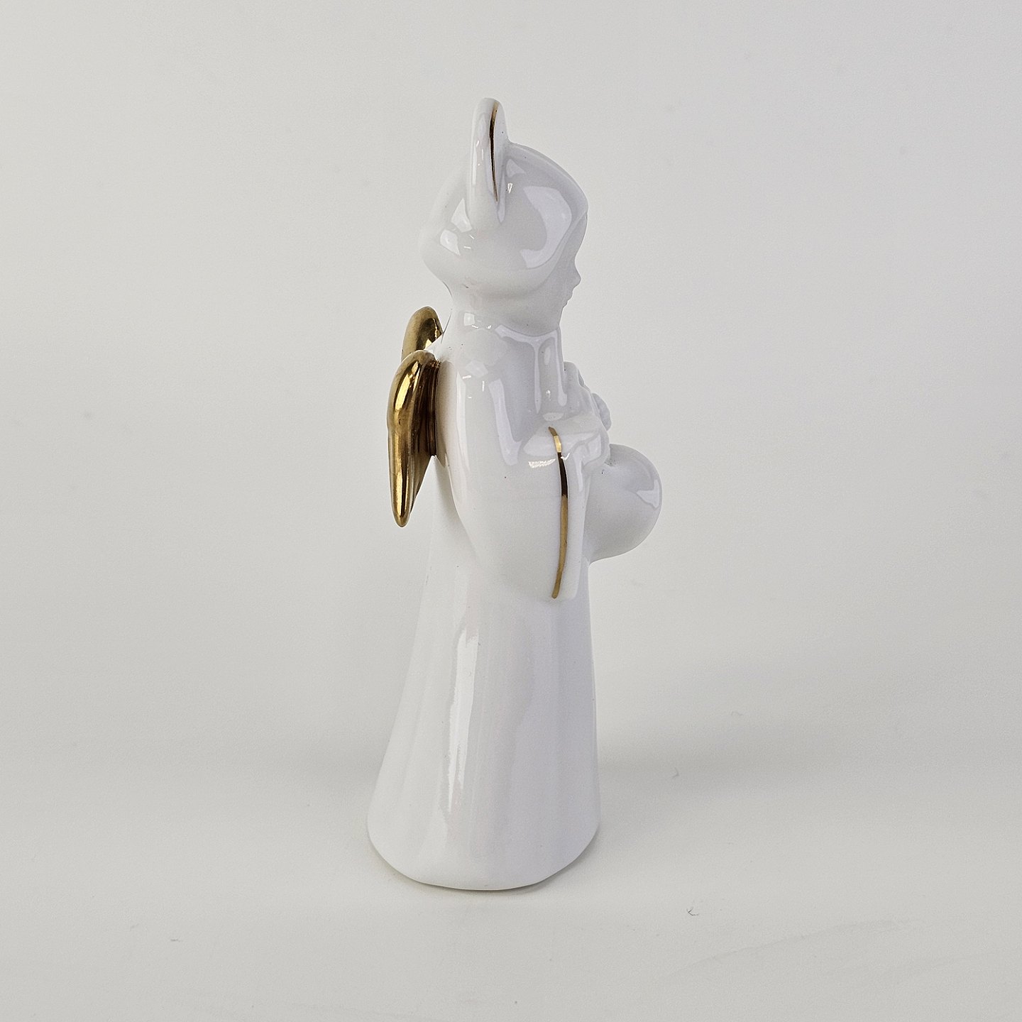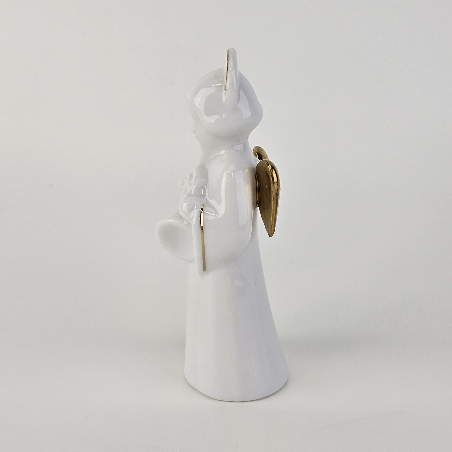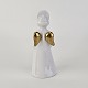 Figur med motiv af en engel som spiller på valdhorn. Figuren er i hvidt porcelæn med forgyldte vinger og detaljer i 24 karat guld.