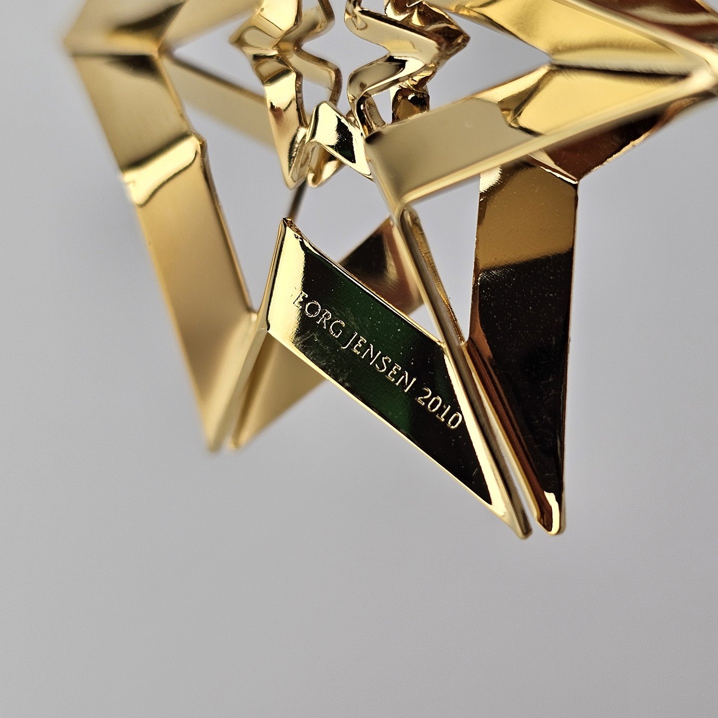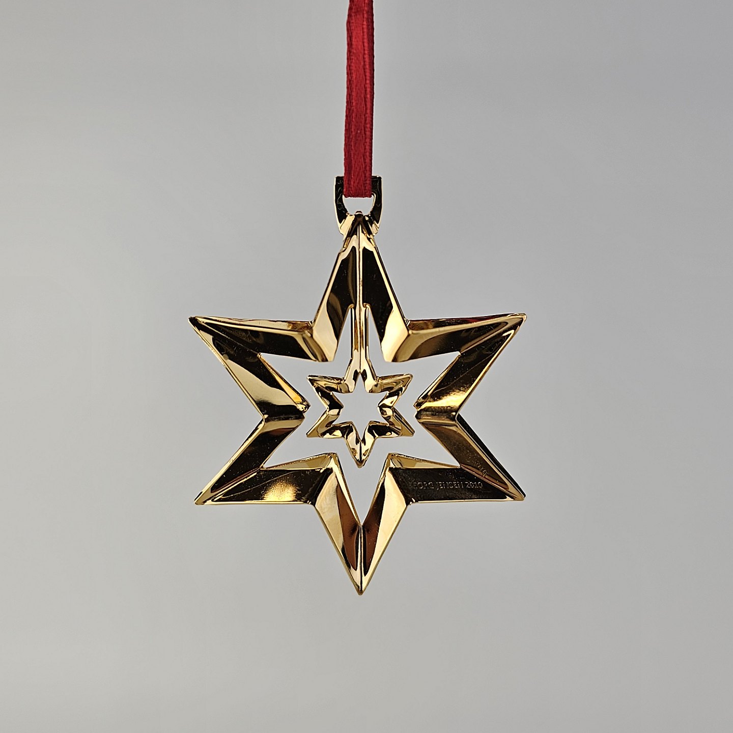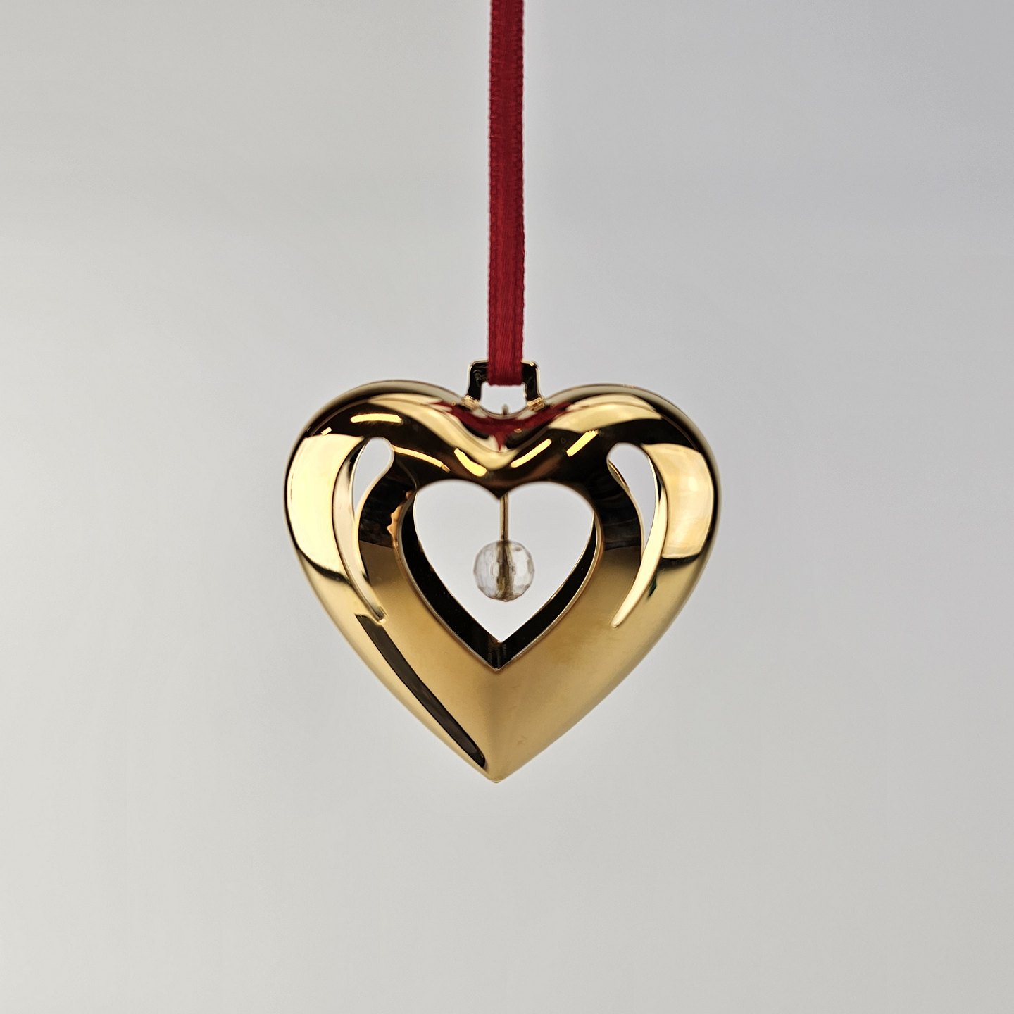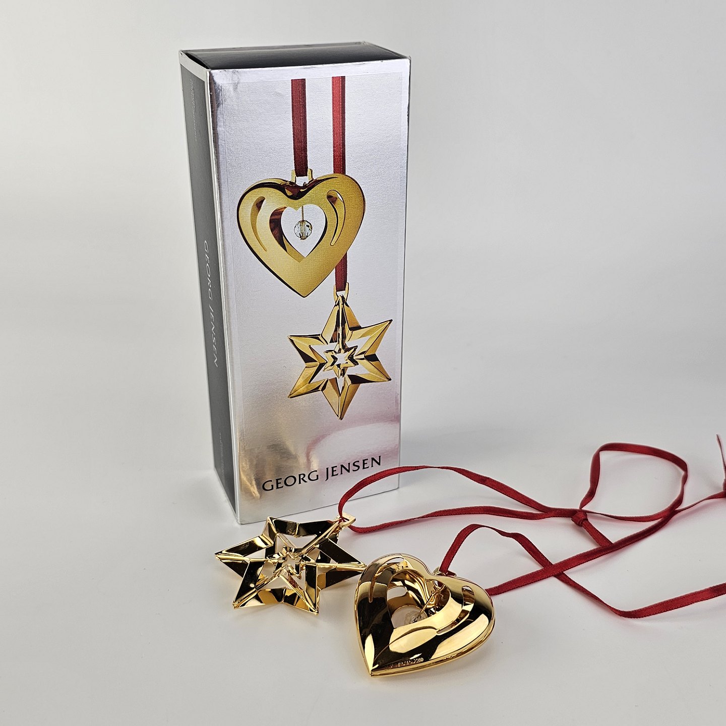 To juleornamenter til ophæng med form af et hjerte og en stjerne i messing forgyldt med 24 karat guld