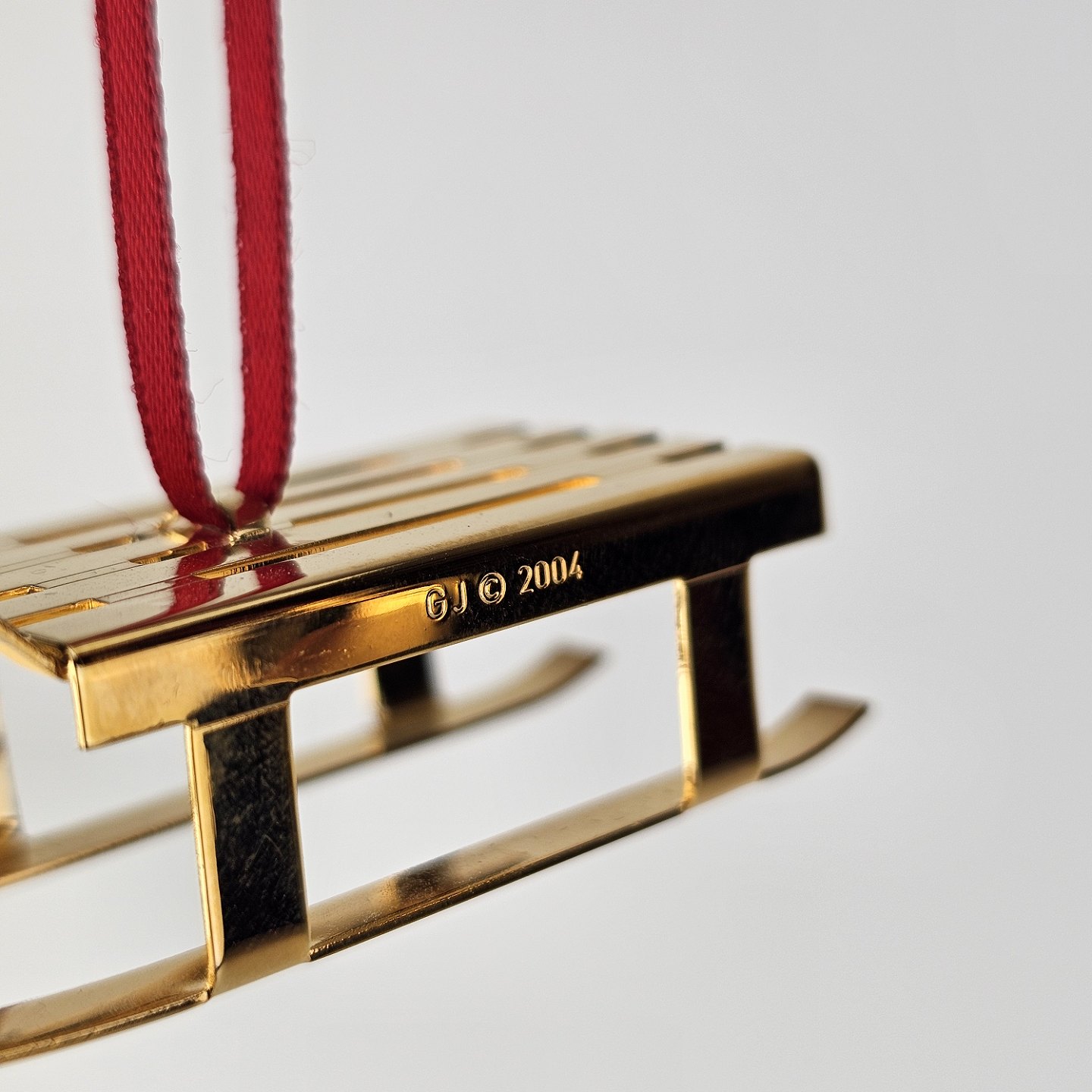 To juleornamenter til ophæng med form af en snemand og en kælk i messing forgyldt med 24 karat guld
