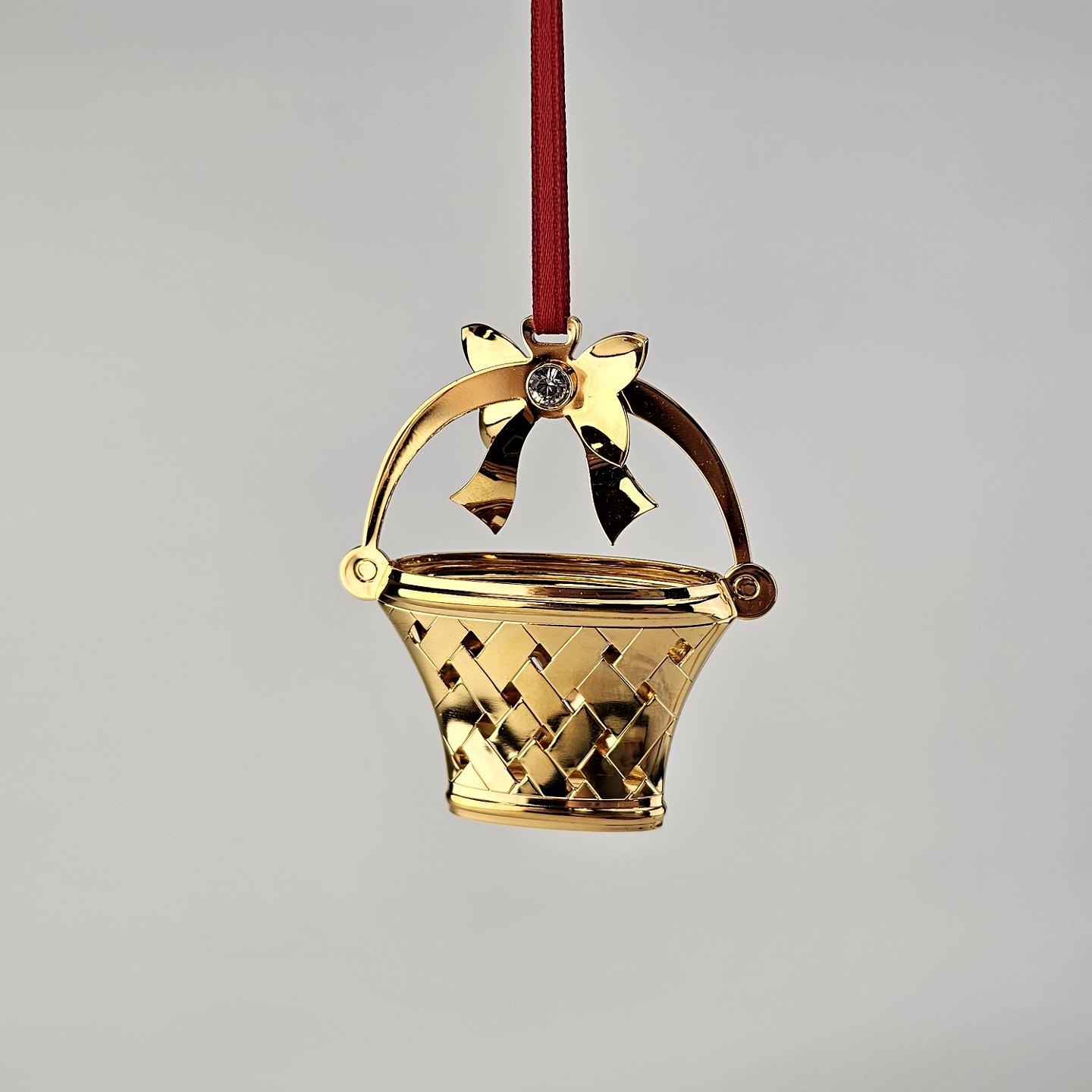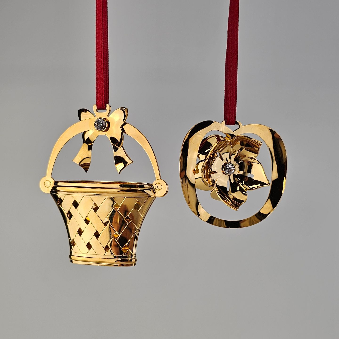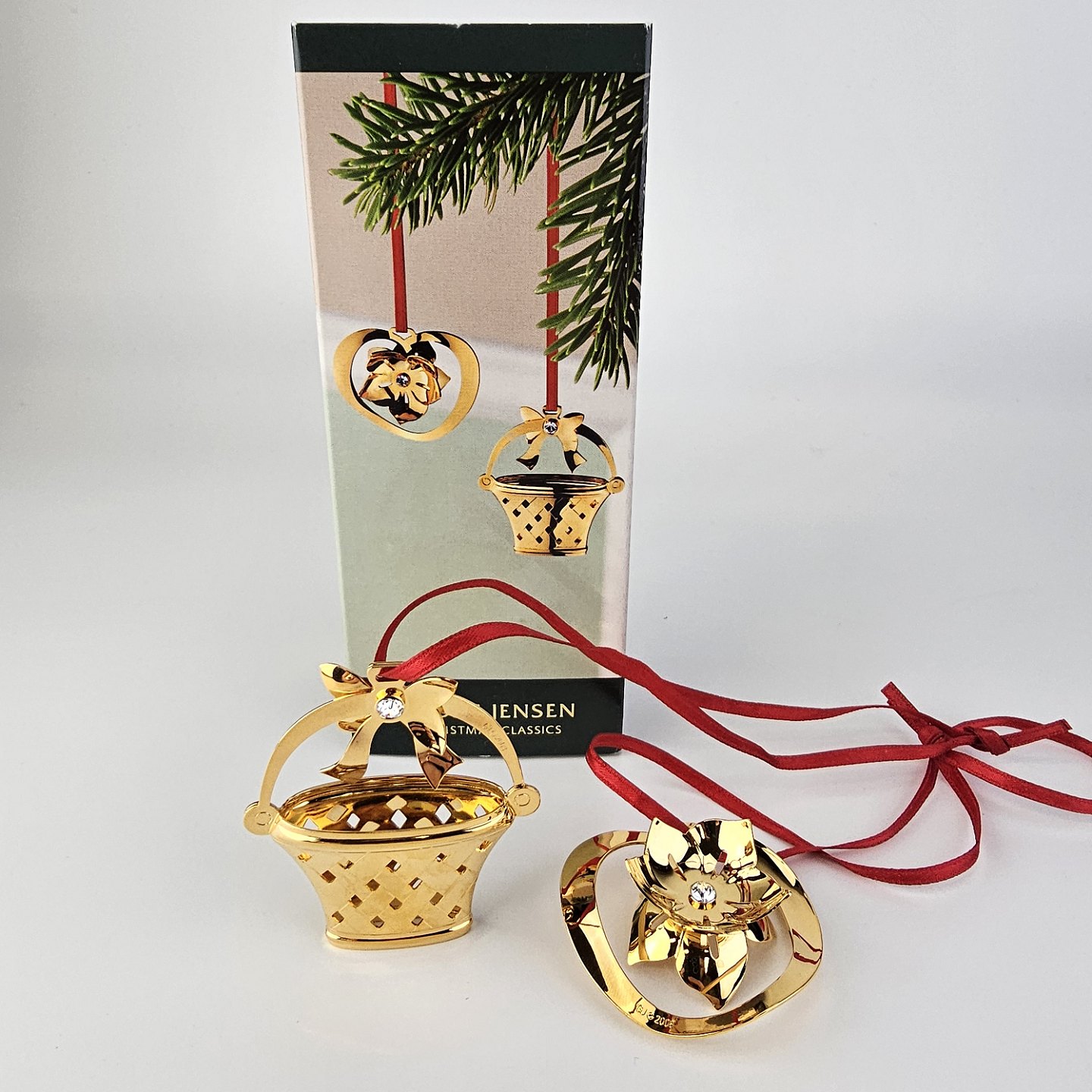 To juleornamenter til ophæng med form af en kurv og en julerose i messing forgyldt med 24 karat guld