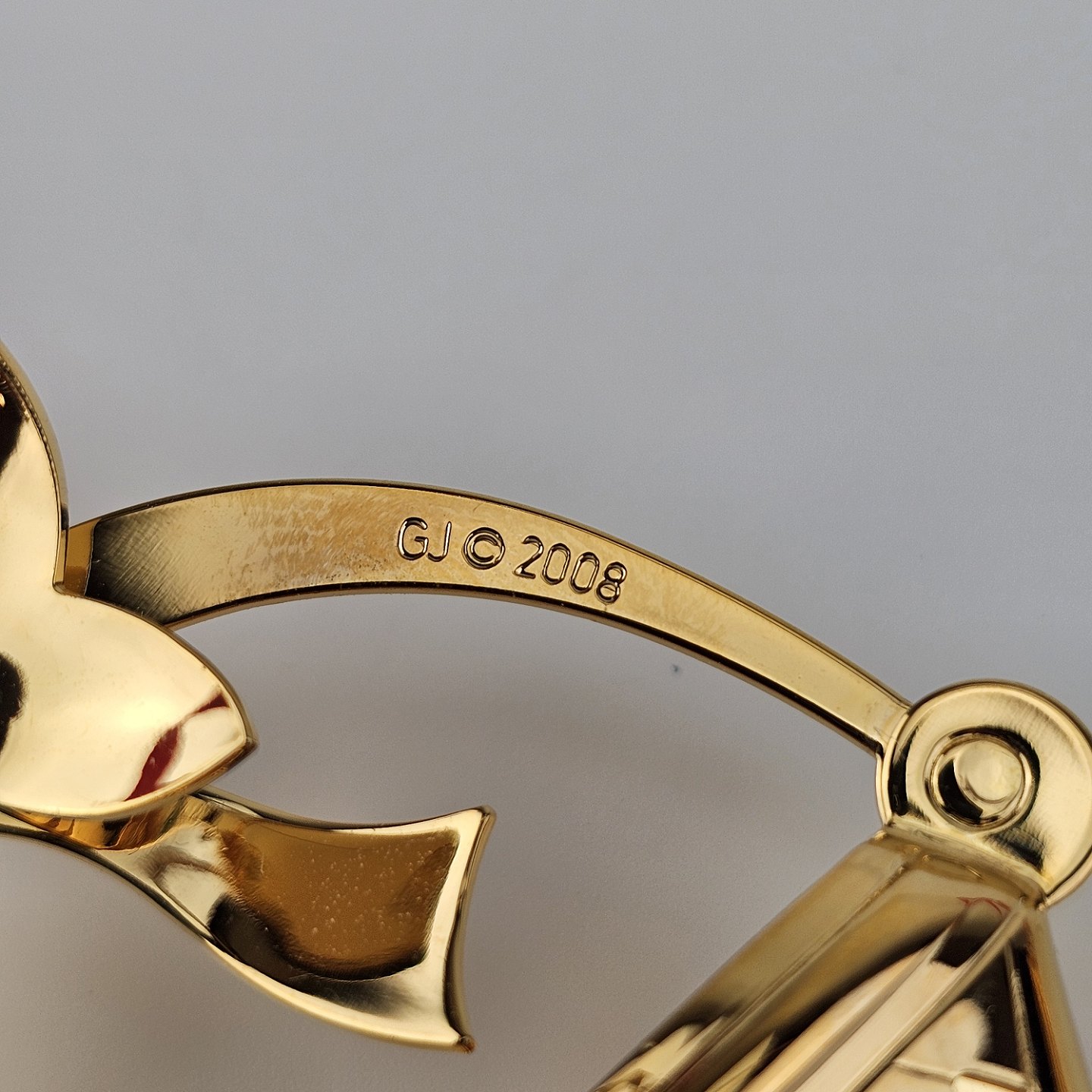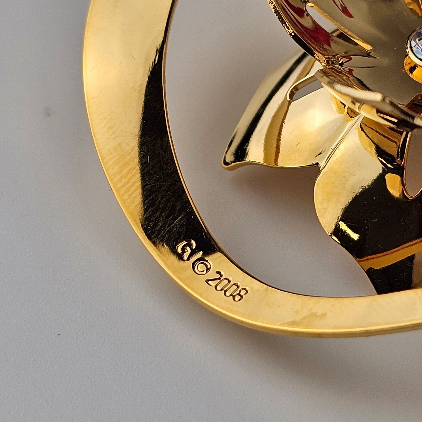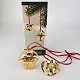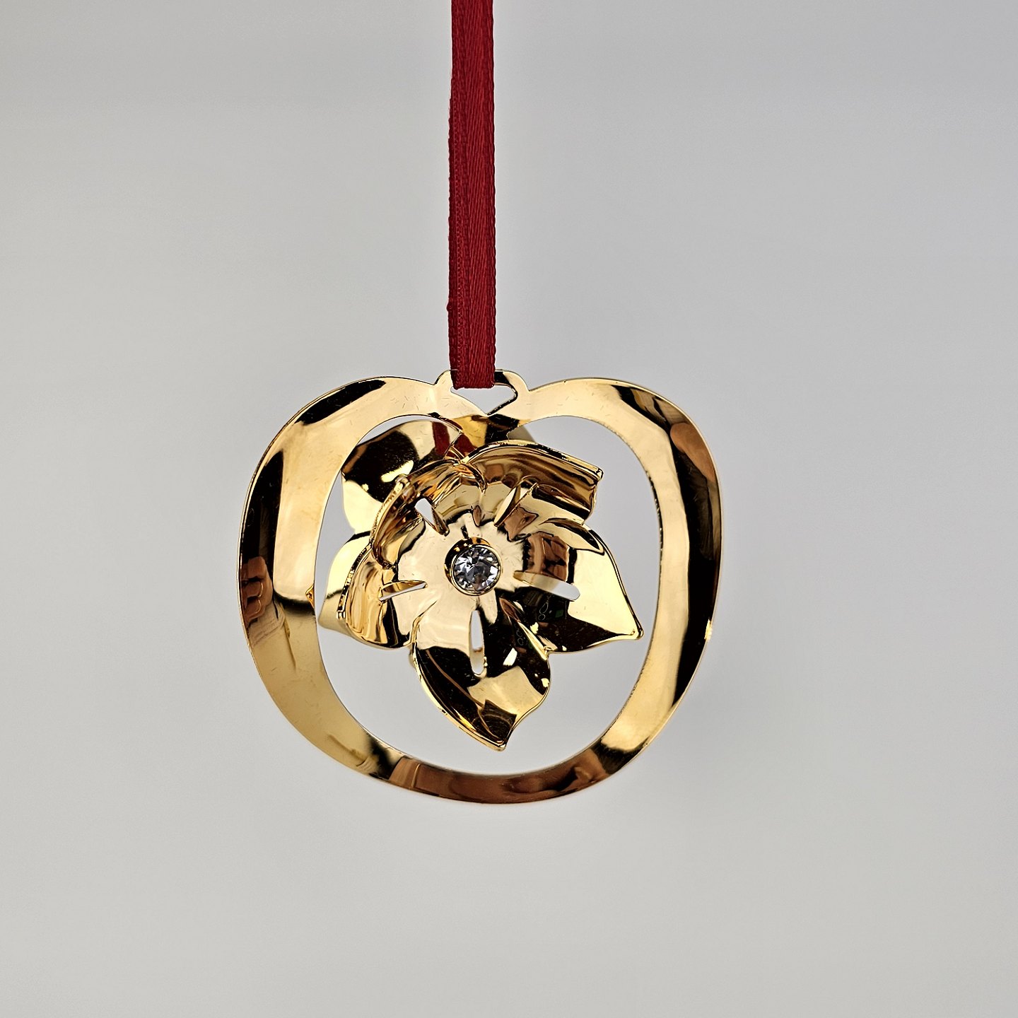 To juleornamenter til ophæng med form af en kurv og en julerose i messing forgyldt med 24 karat guld