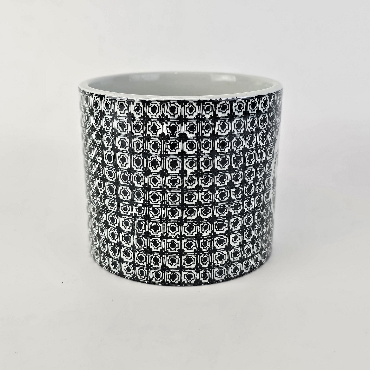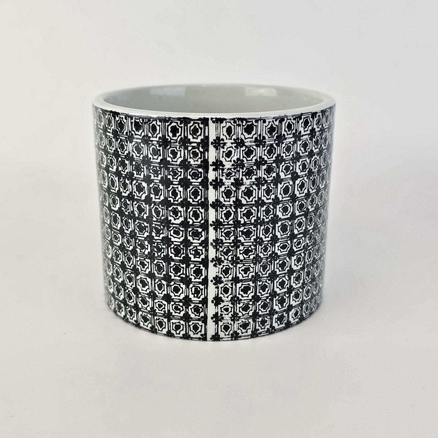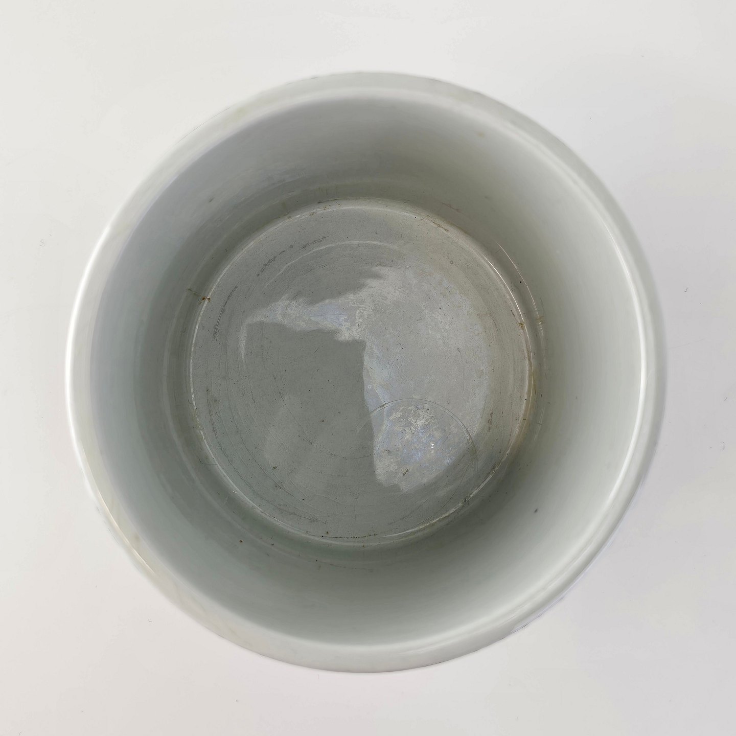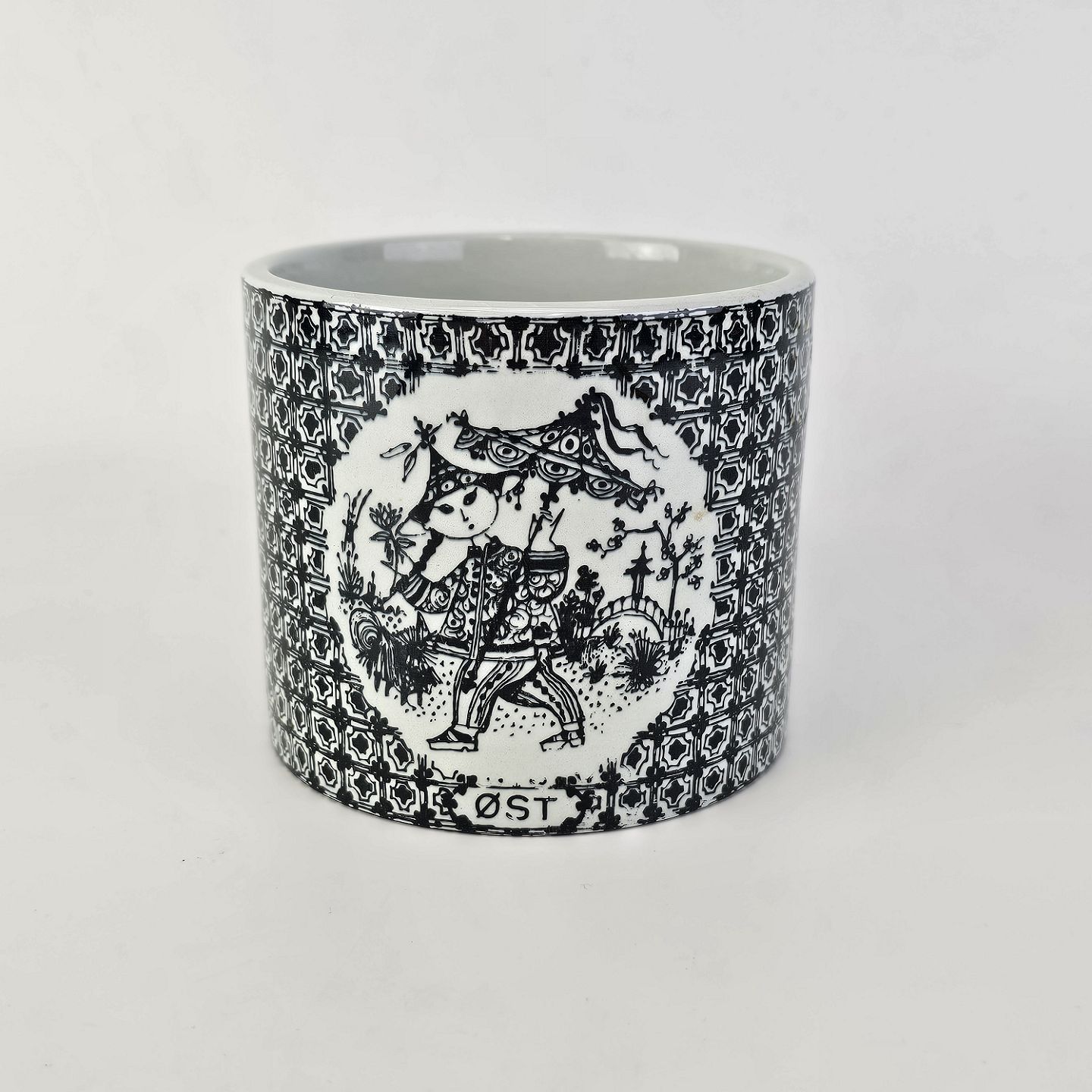 Urtepotteskjuler i porcelæn med motiv i sort streg af kineser samt titlen Øst. Nr. 3022-697