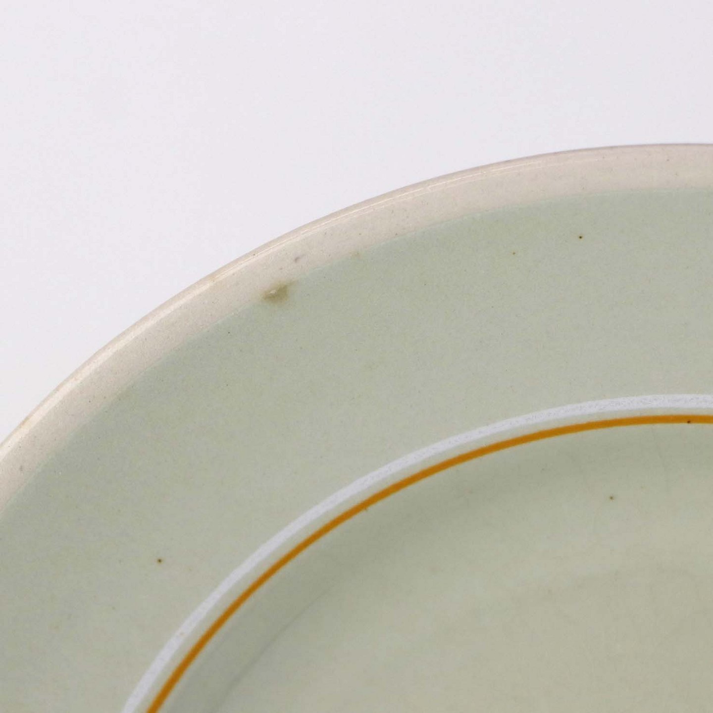 Fremstår med mindre sorte nister og mørkning under glasuren på tallerkens frontside.