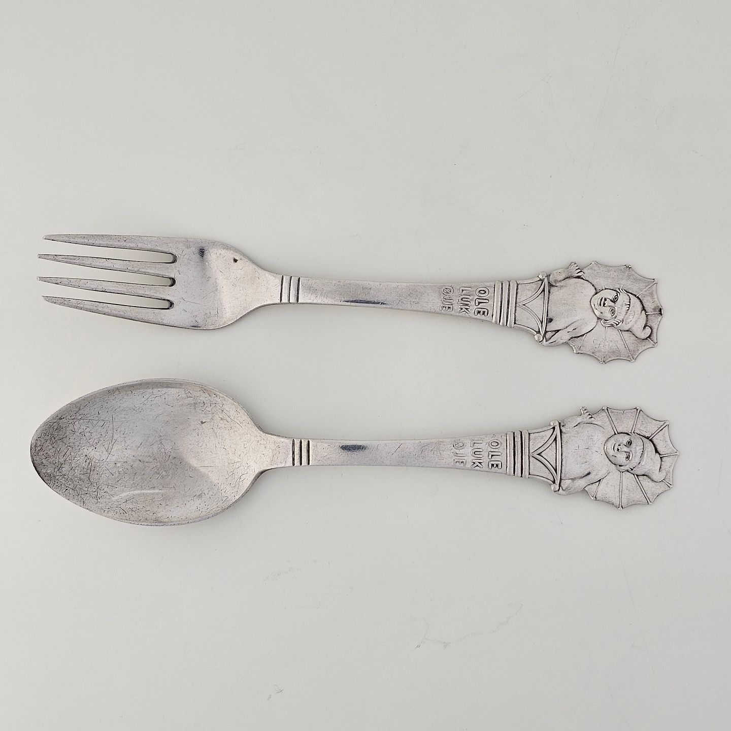 Gaffel og ske i tretårnet sølv med motiv af Ole Lukøje