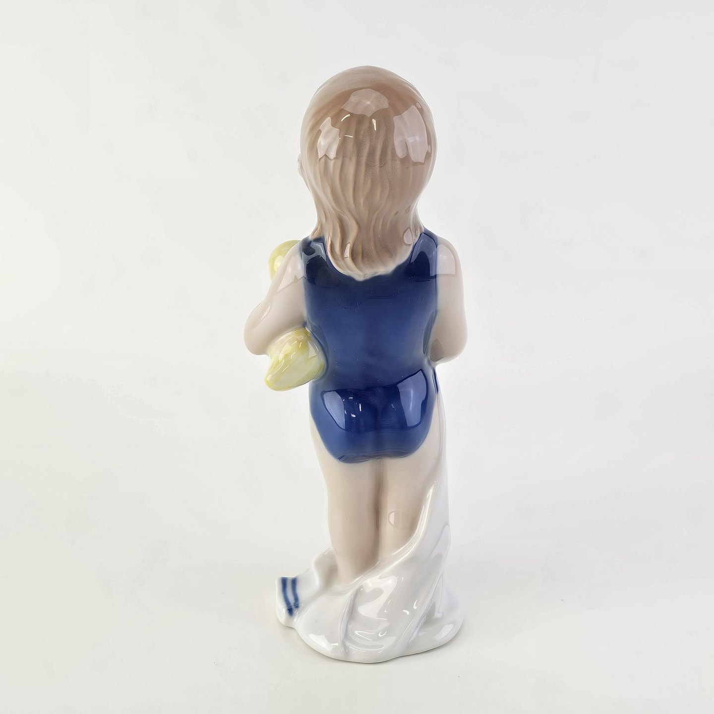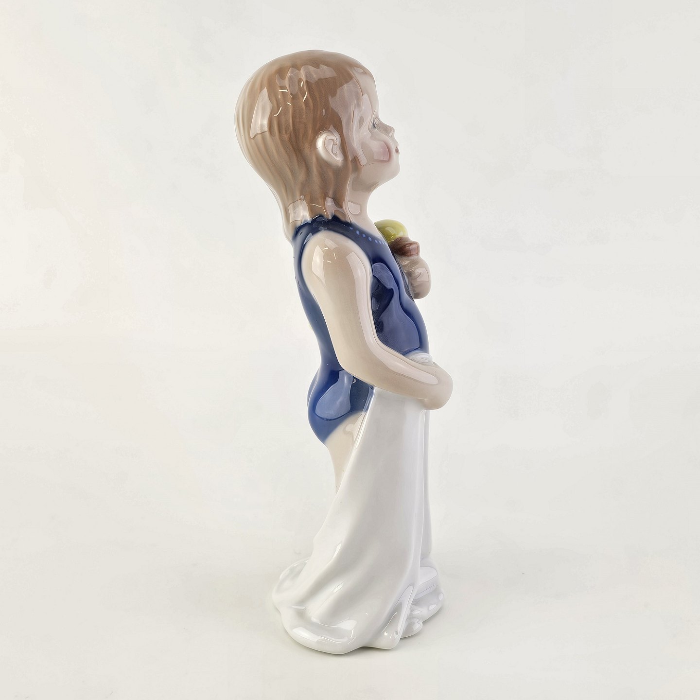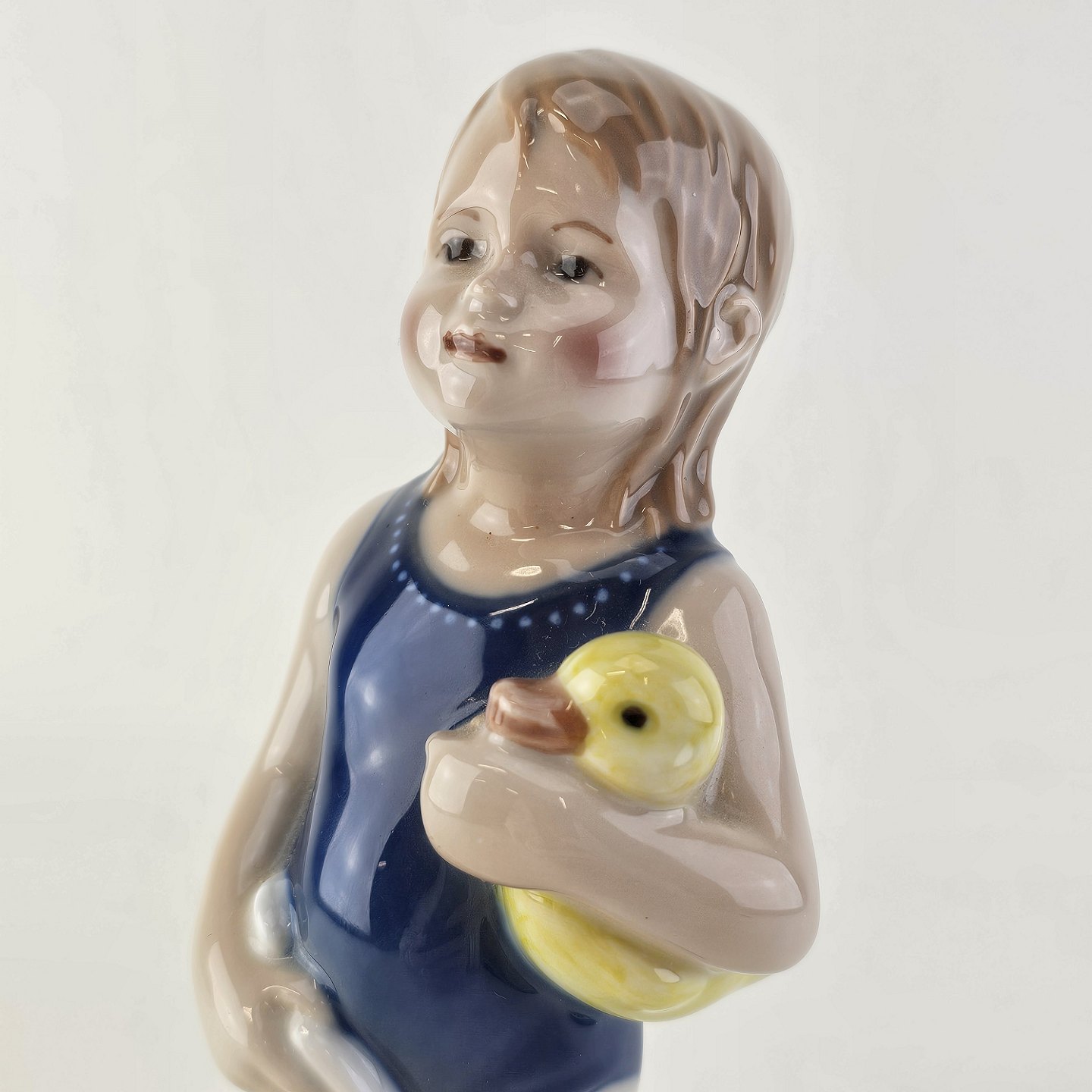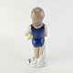 Figur i kongeligt porcelæn med form af en lille pige i en blå badedragt med et håndklæde og en badeand