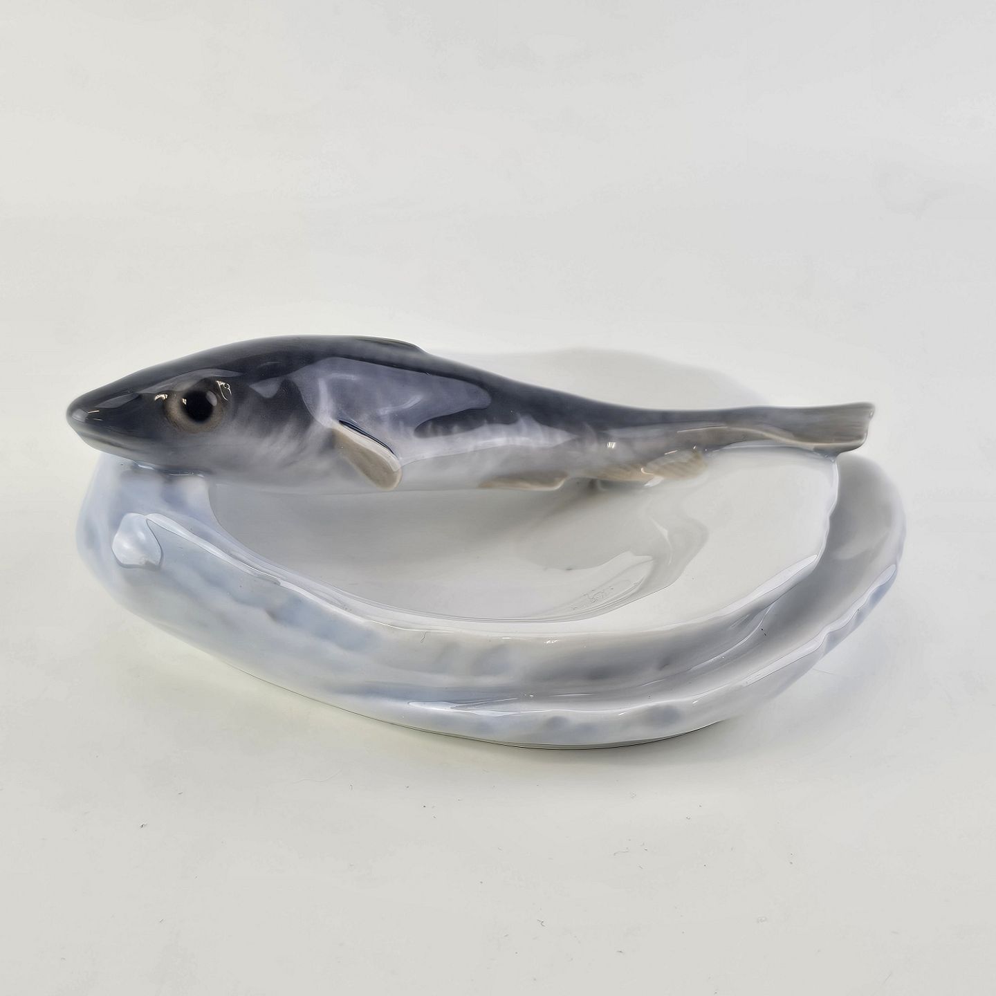 Sjælden skål i kongeligt porcelæn i art nouveau stil med form af to muslingeskaller med en fisk