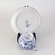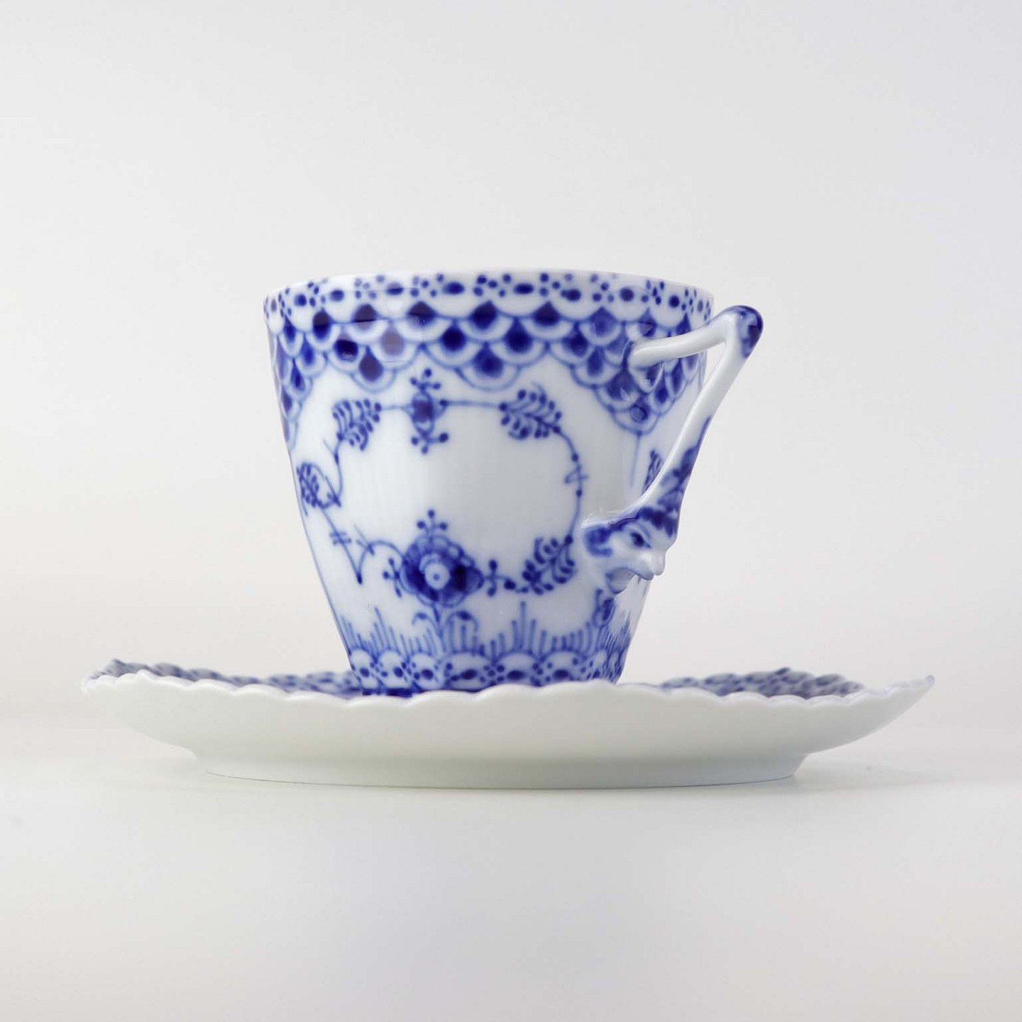 Musselmalet helblonde er riflet hvidt porcelæn med dekoration af blå ranker og en kant med blonder.