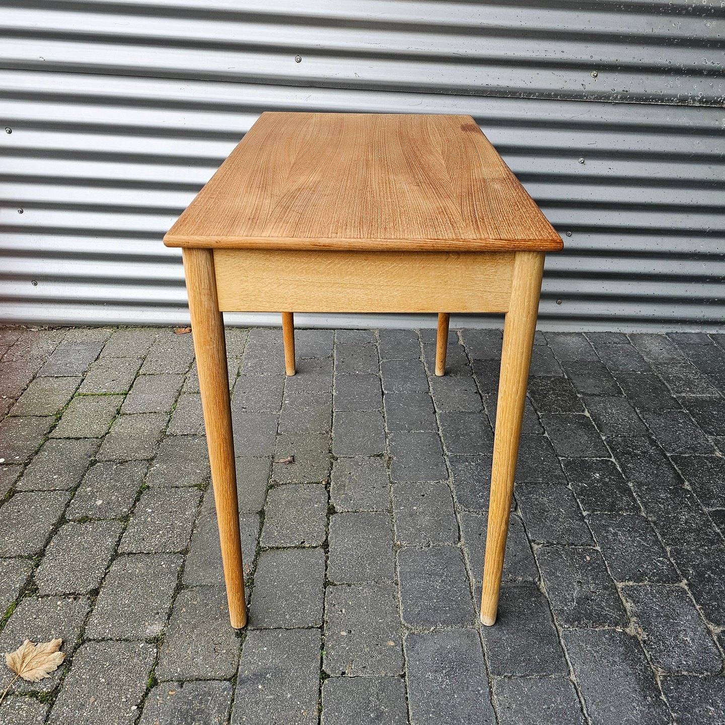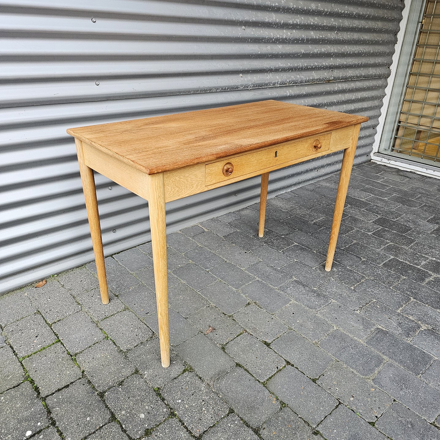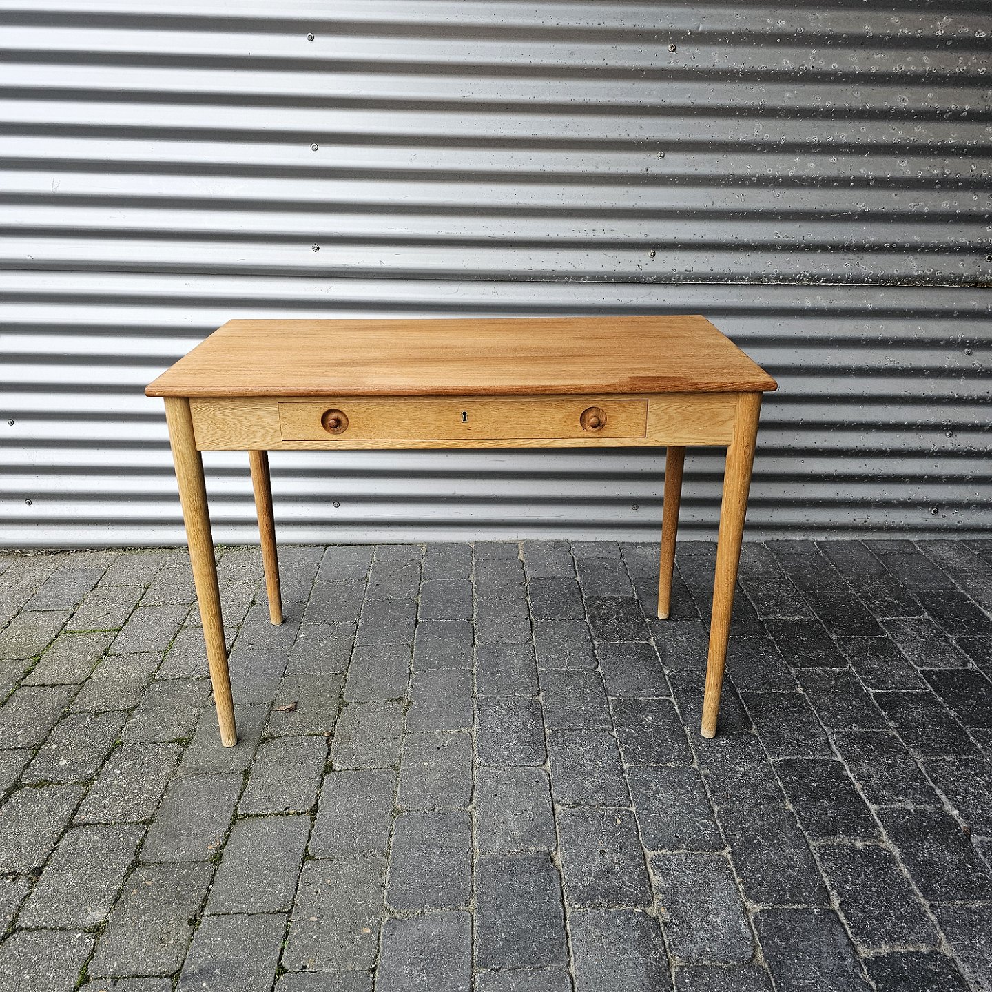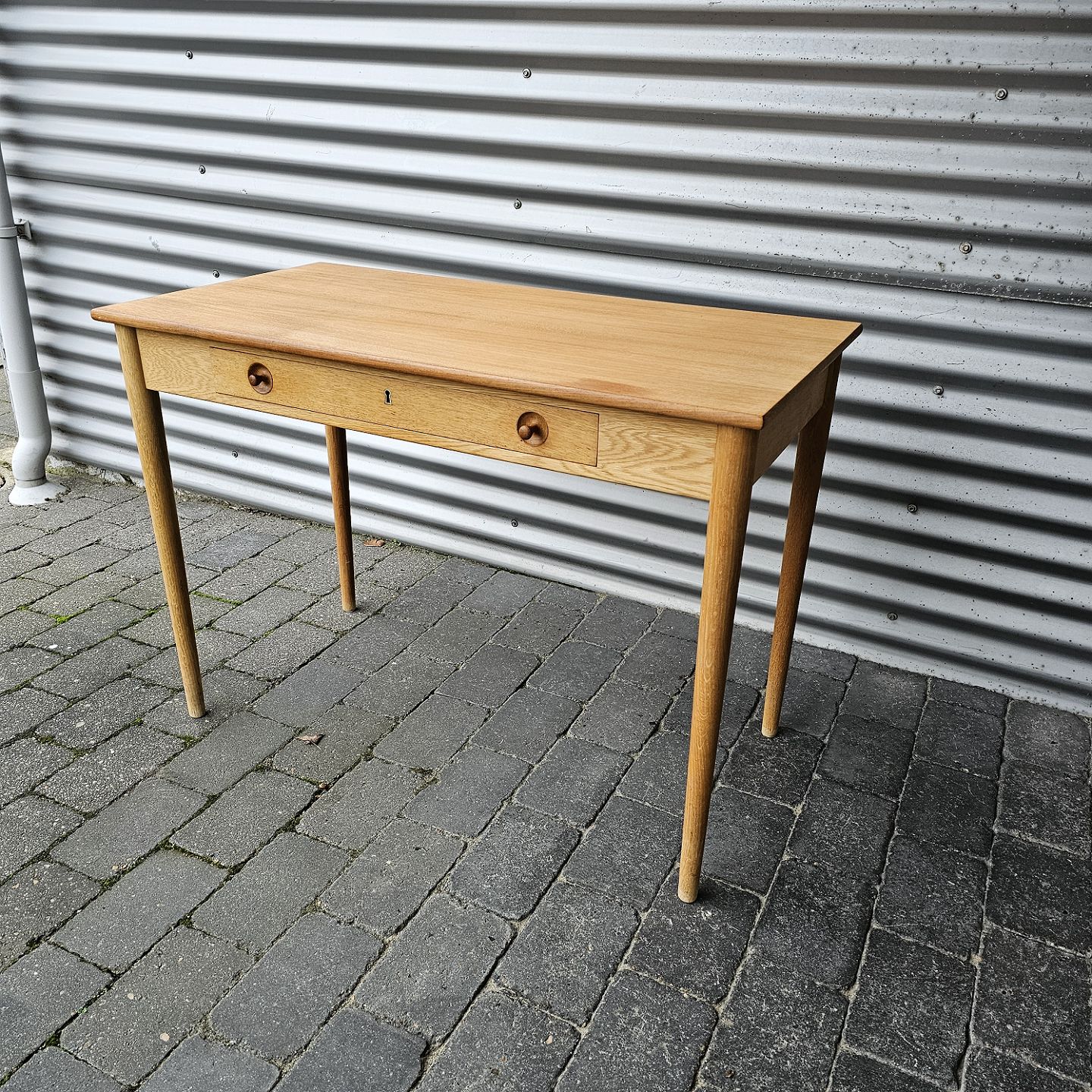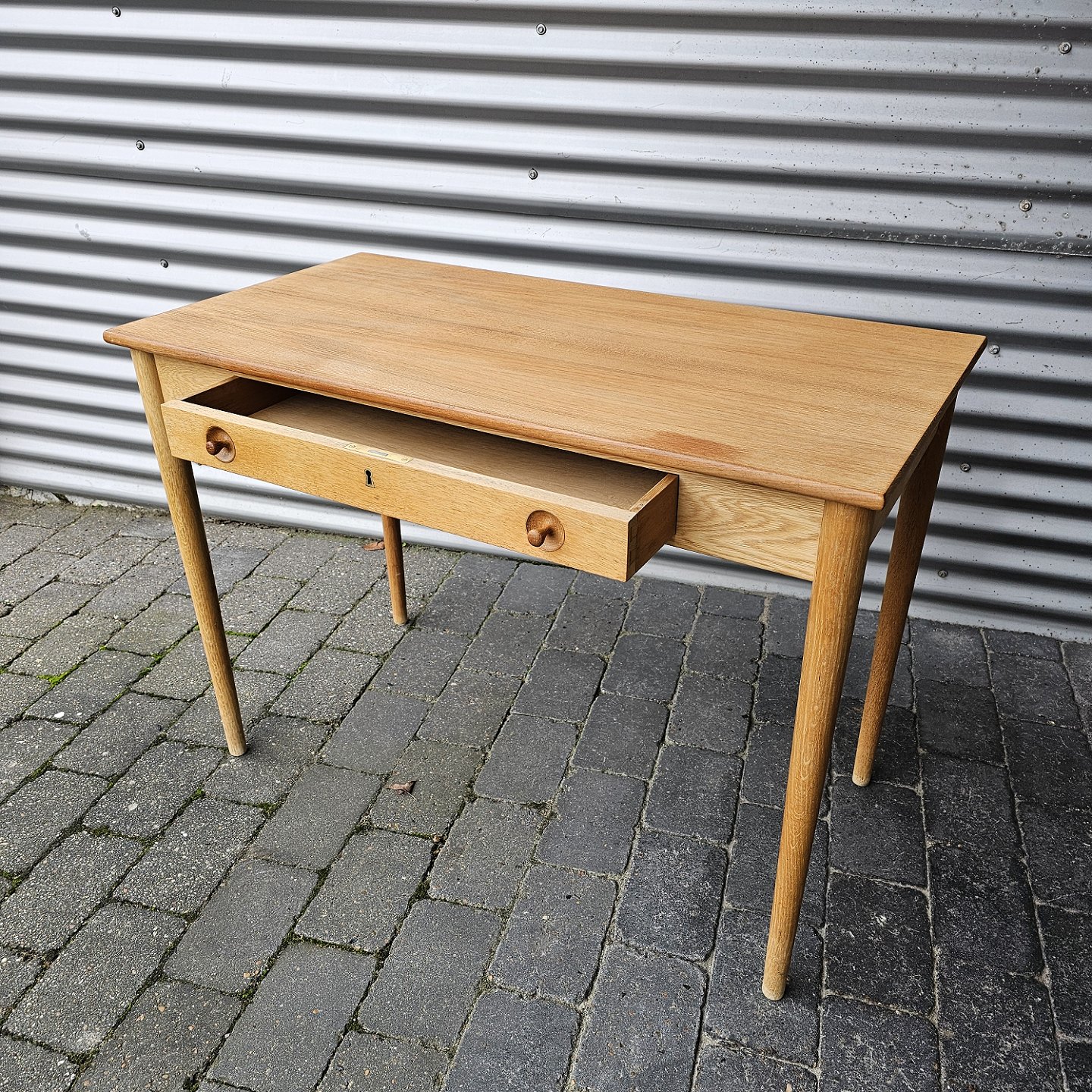 Skrivebord i teaktræ med stor skuffe og lås, også kaldet dameskrivebord