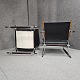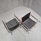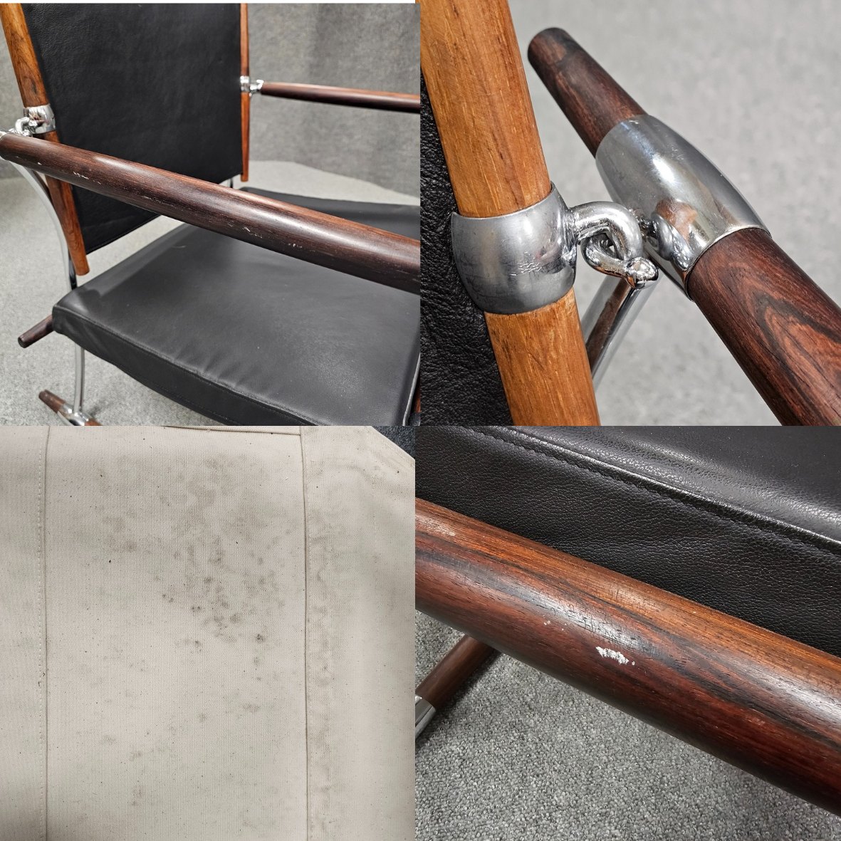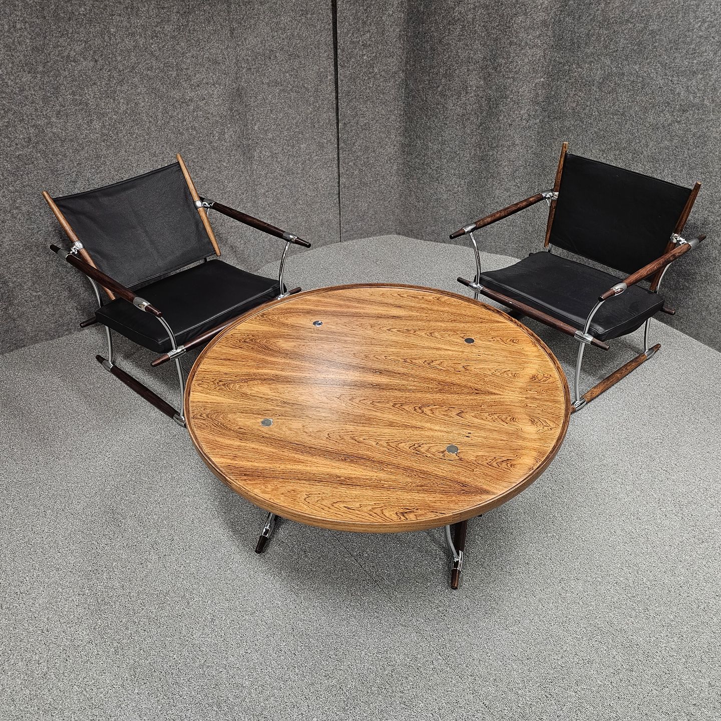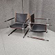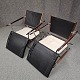 Sæt af to stokkestole med stel i palisander og forkromet stål og sæde af sort læder.