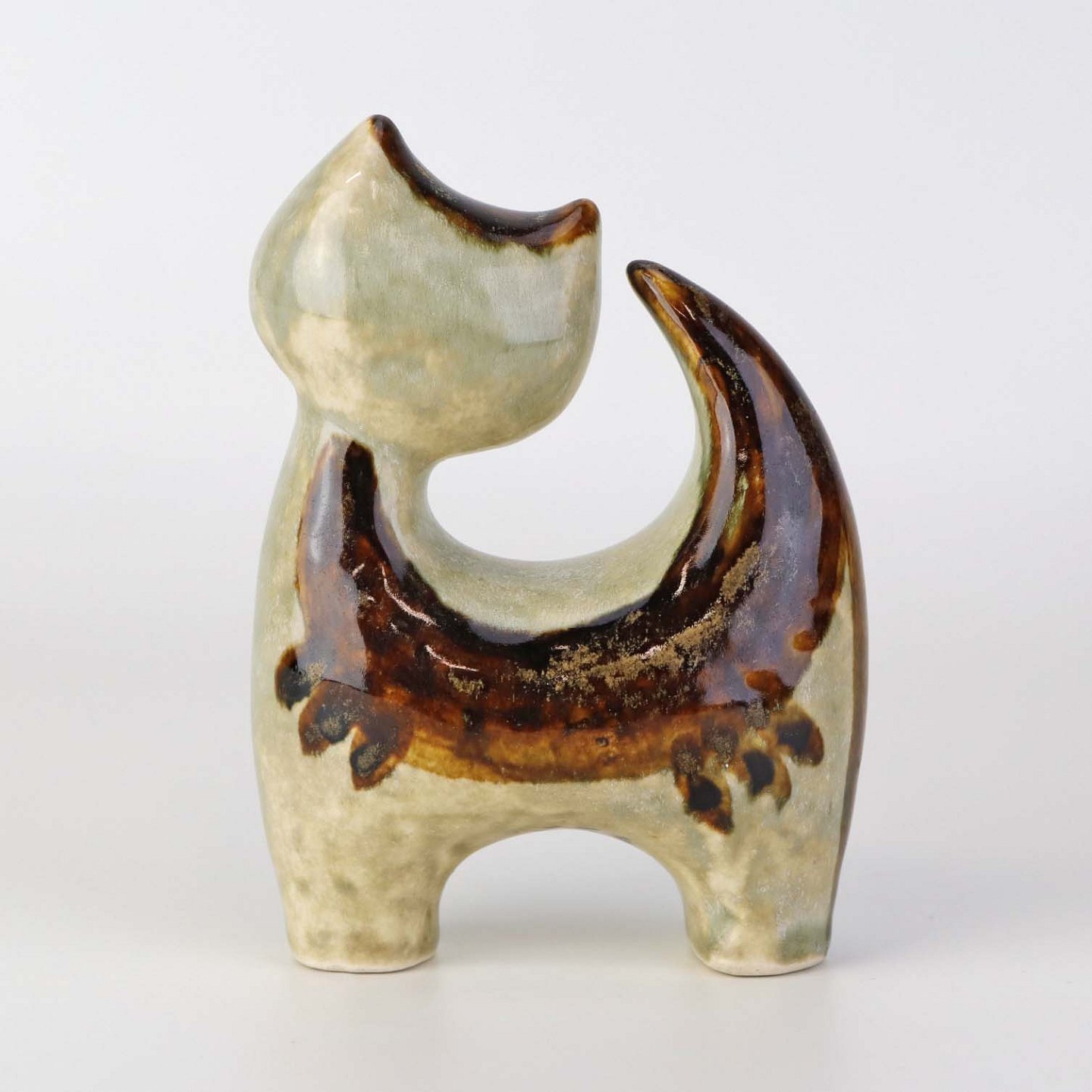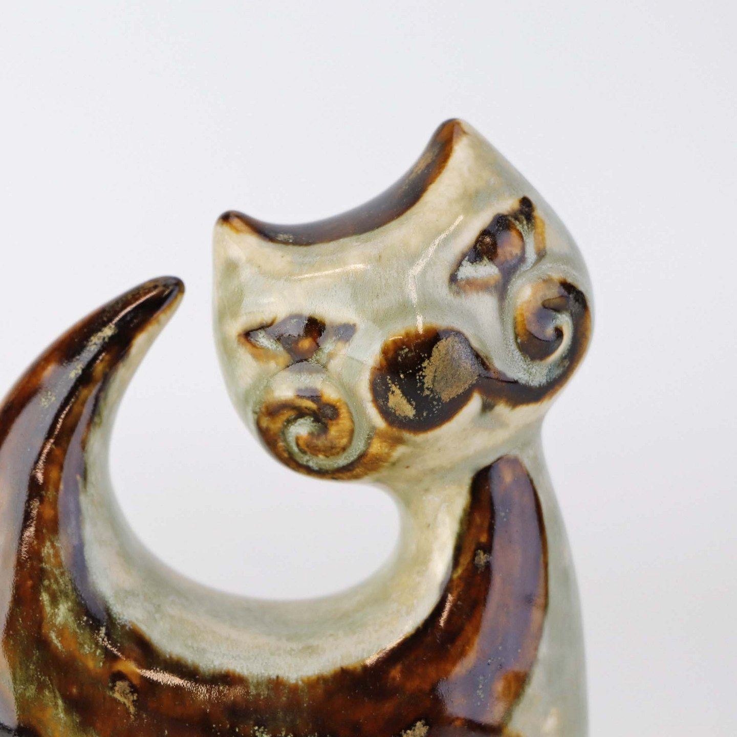 Figur i glaseret keramik med motiv af en kat.