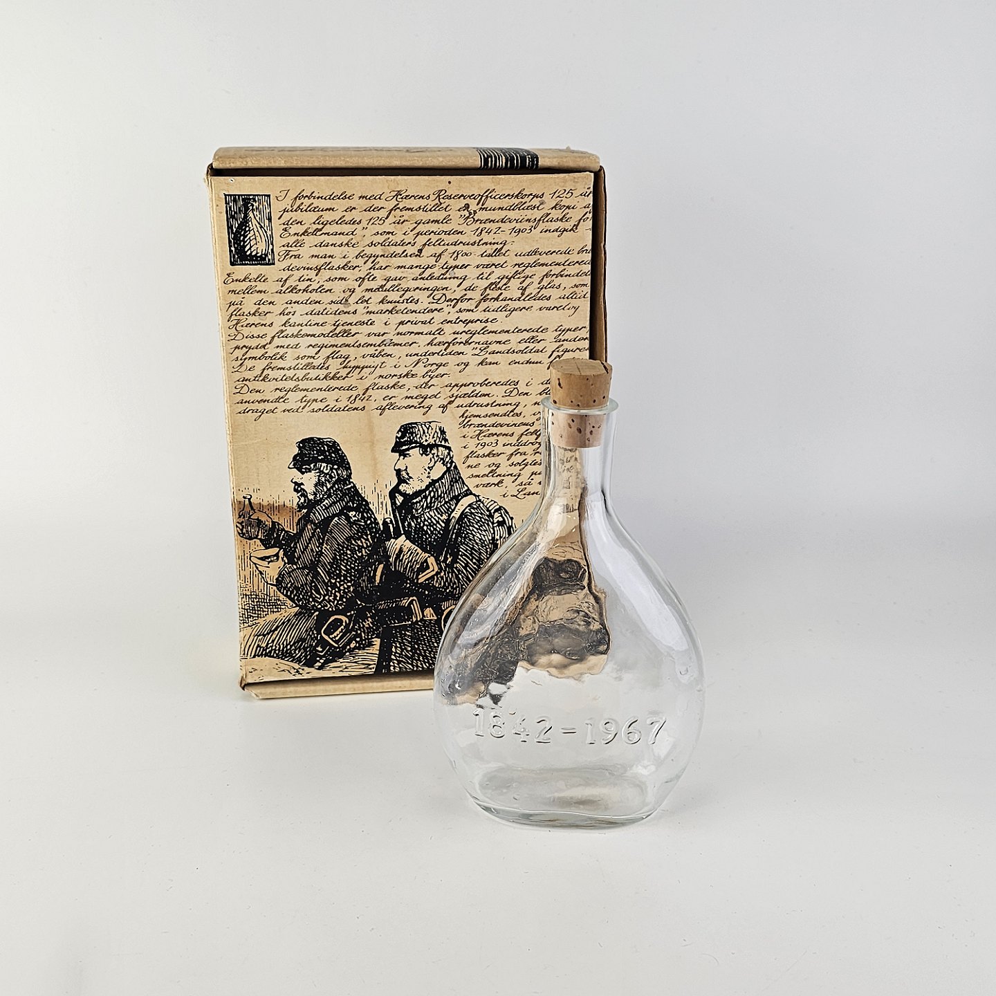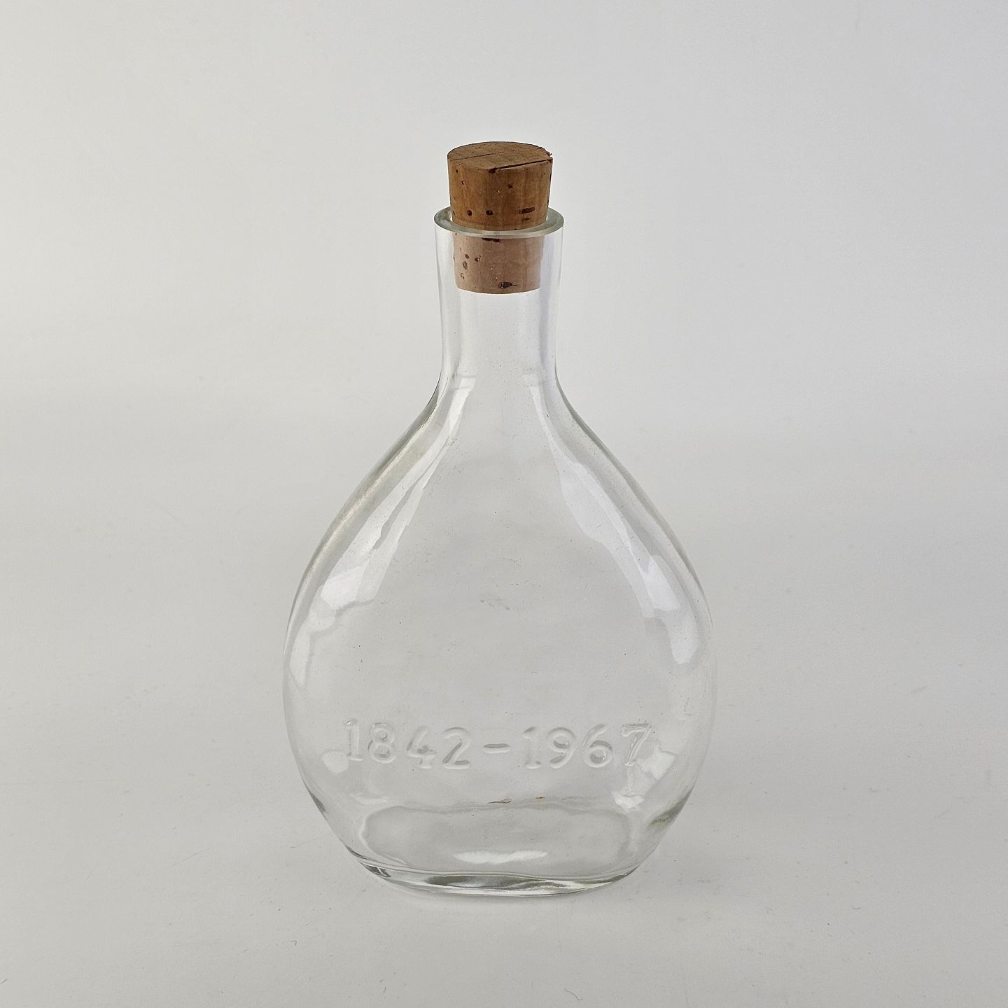 Brændevinsflaske med korkprop og teksten 1842-1967